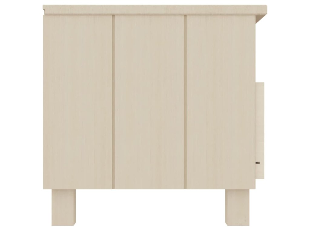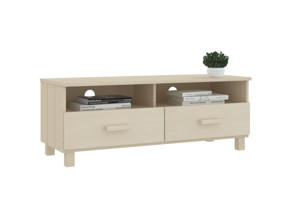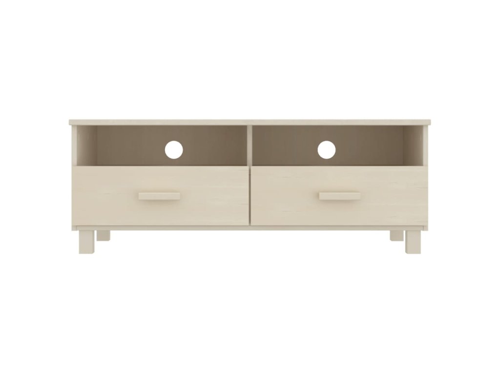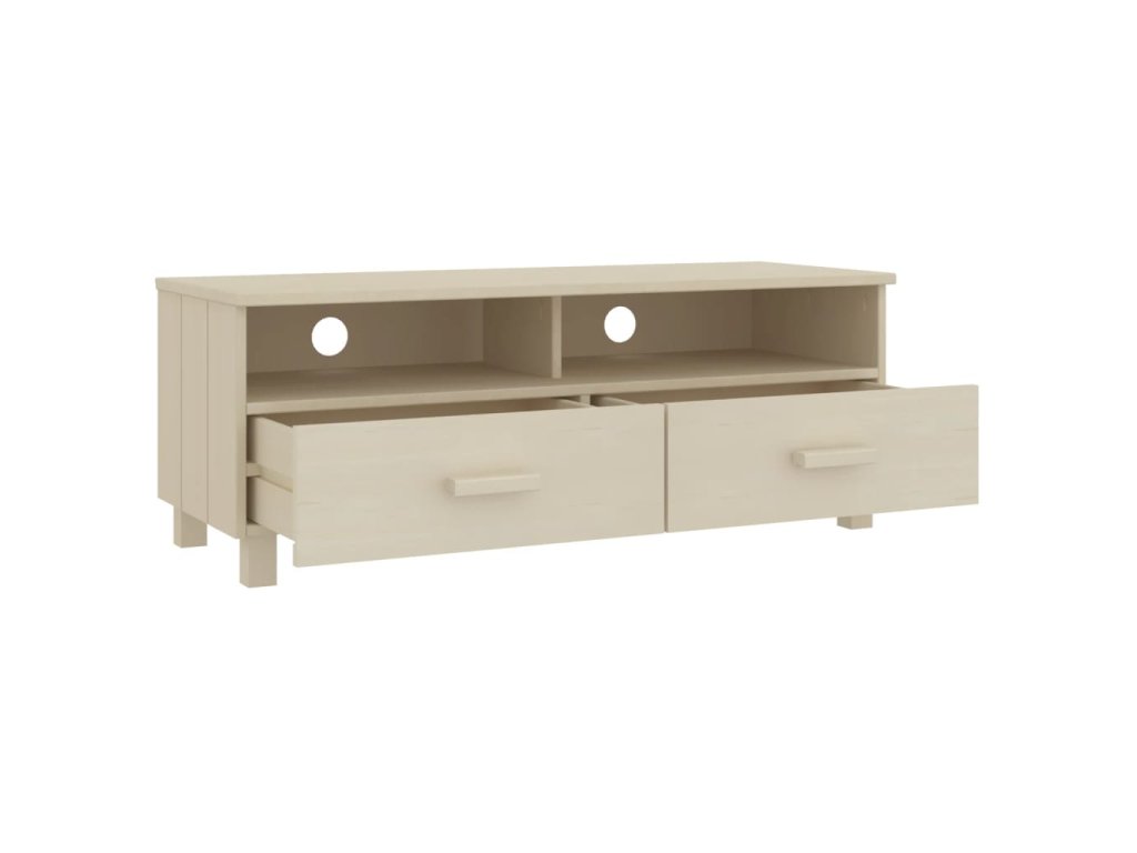 TV stolek je vyrobený z masivního borového dřeva, je tedy stabilní a odolný. TV skříňka obsahuje 2 hladce výsuvné zásuvky a 2 přihrádky, poskytne vám tedy spoustu místa k přehlednému uspořádání vašich multimediálních zařízení, knih a dalších věcí, které tak budete mít neustále po ruce. Robustní stolní deska se skvěle hodí k vystavení dekorativních předmětů, zarámovaných fotografií a pokojových rostlin. Vzadu je navíc otvor, takže můžete kabely schovat za skříňku, abyste je neměli zbytečně na očích.