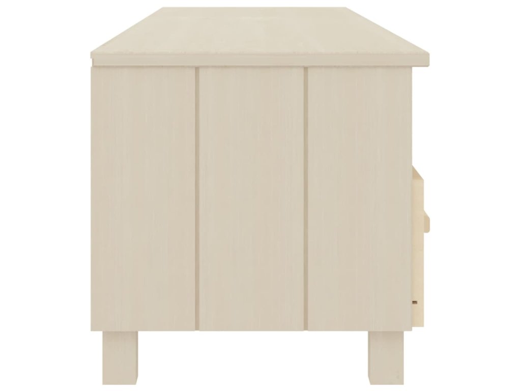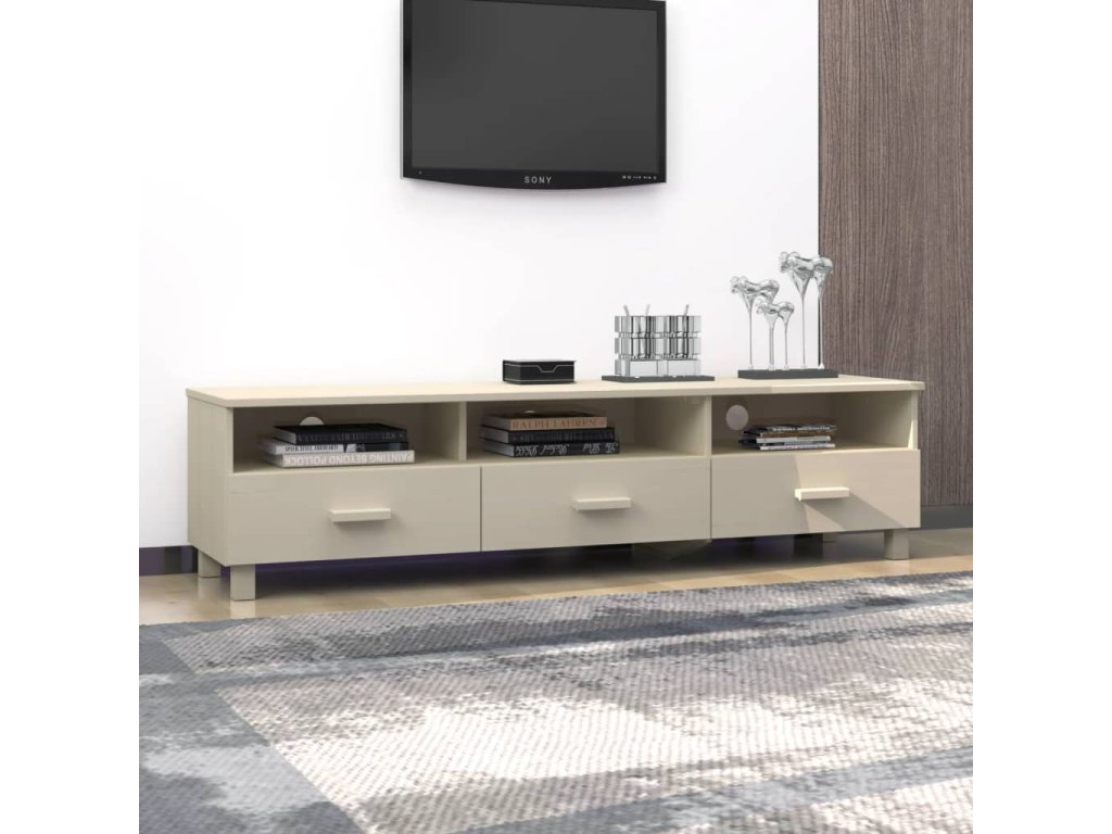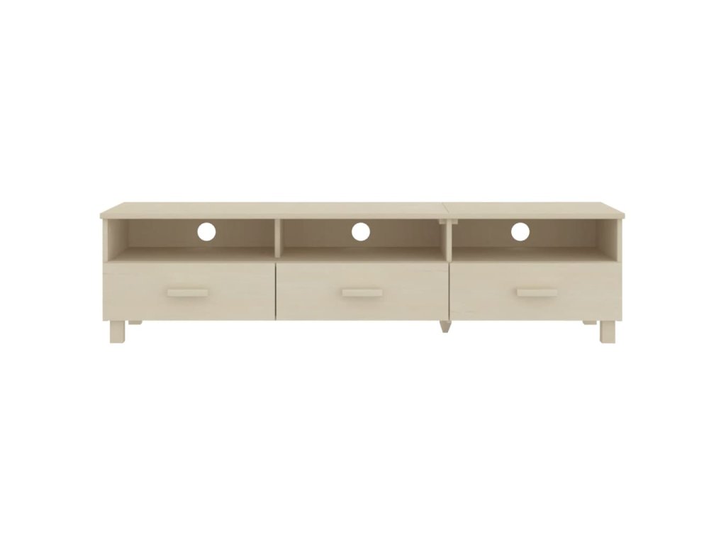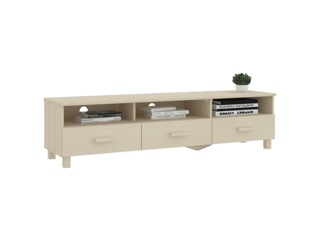 TV stolek je vyrobený z masivního borového dřeva, je tedy stabilní a odolný. TV skříňka obsahuje 3 hladce výsuvné zásuvky a 3 přihrádky, poskytne vám tedy spoustu místa k přehlednému uspořádání vašich multimediálních zařízení, knih a dalších věcí, které tak budete mít neustále po ruce. Robustní stolní deska se skvěle hodí k vystavení dekorativních předmětů, zarámovaných fotografií a pokojových rostlin. Vzadu je navíc otvor, takže můžete kabely schovat za skříňku, abyste je neměli zbytečně na očích.
