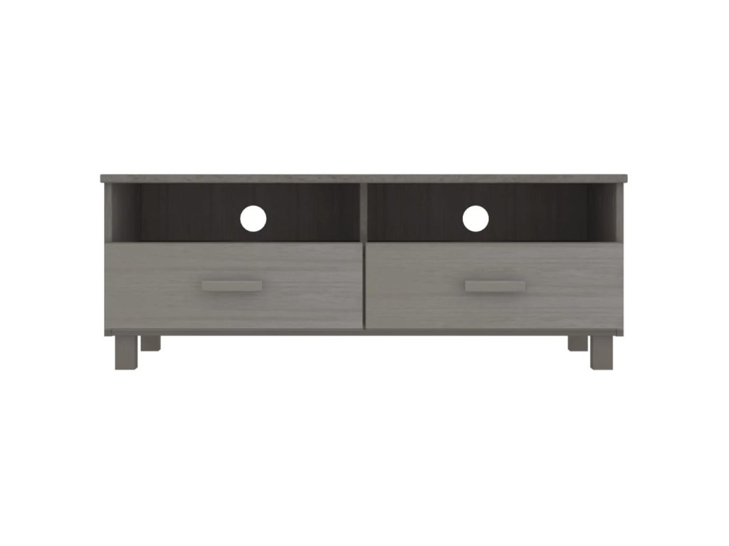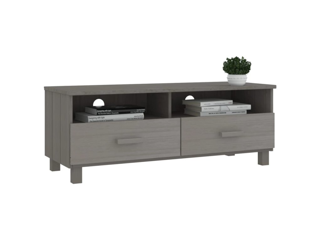TV stolek je vyrobený z masivního borového dřeva, je tedy stabilní a odolný. TV skříňka obsahuje 2 hladce výsuvné zásuvky a 2 přihrádky, poskytne vám tedy spoustu místa k přehlednému uspořádání vašich multimediálních zařízení, knih a dalších věcí, které tak budete mít neustále po ruce. Robustní stolní deska se skvěle hodí k vystavení dekorativních předmětů, zarámovaných fotografií a pokojových rostlin. Vzadu je navíc otvor, takže můžete kabely schovat za skříňku, abyste je neměli zbytečně na očích.