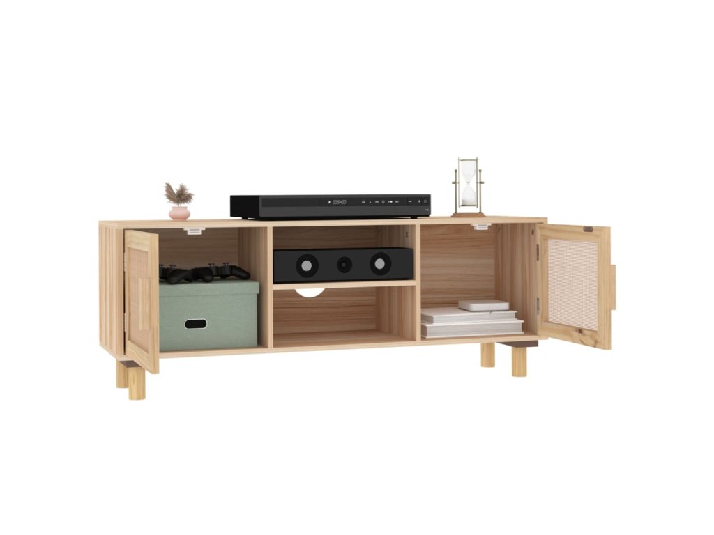 - Dostatek úložného prostoru: TV stolek je vybaven 4 přihrádkami a poskytuje dostatek úložného prostoru, abyste měli všechny vaše časopisy, DVD a další věci pěkně uspořádané. Přírodní ratanový výplet na dvířkách jí dodává na kráse.