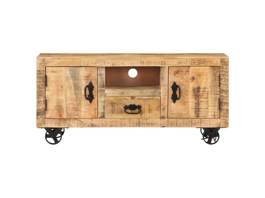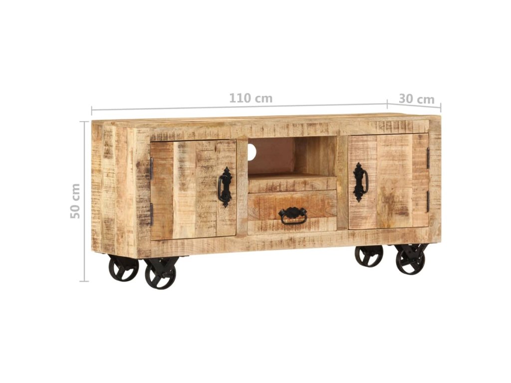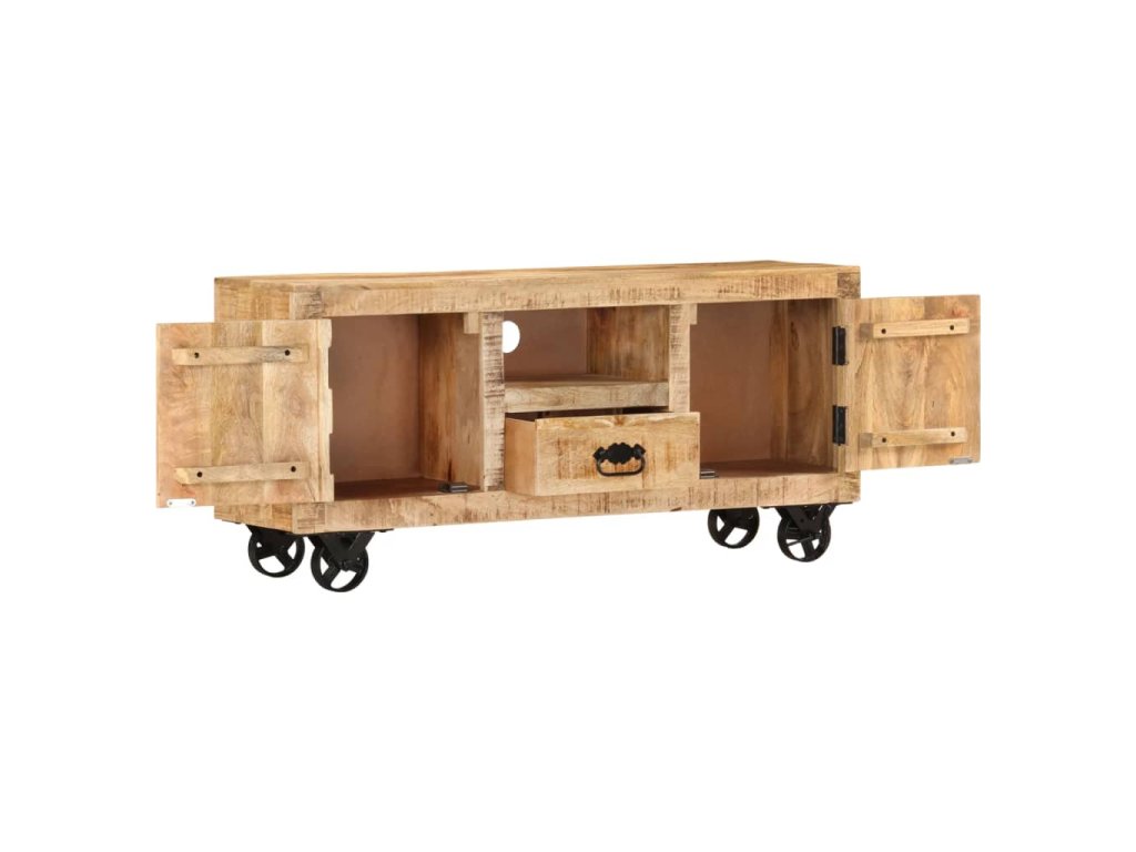 TV stolek je ručně vyroben z hrubého mangovníkového masivu, což mu dodává stabilitu a odolnost. Navíc i dobře vypadá díky způsobu výroby, která umocňuje jeho retro vzhled. Každý krok výroby je prováděn s největší péčí, ať už jde o leštění, nebo lakování. Řemeslné zpracování a krásná struktura dřeva činí každý kus nábytku unikátní a mírně odlišný od všech ostatních. Stolek má navíc 2 skříňky, 1 zásuvku a 1 poličku, které poskytují dostatek místa pro uložení všech předmětů, které chcete vystavit či si je uschovat někde po ruce. Stolek má 4 železná kolečka, která umocňují jeho industriální vzhled a usnadňují jeho přesun.
