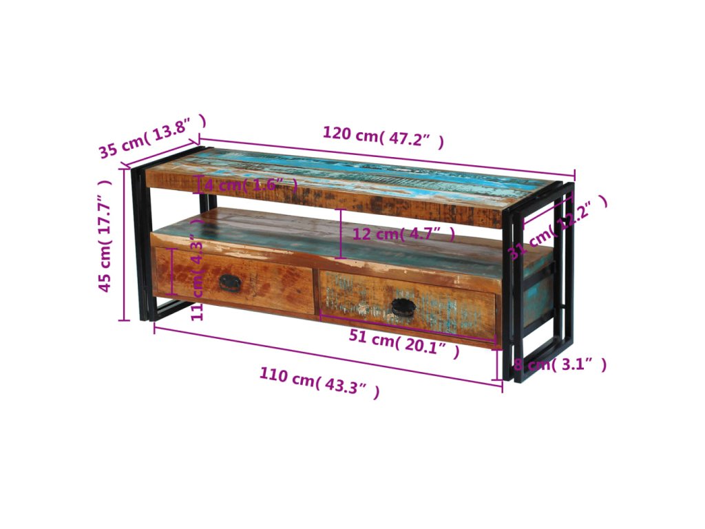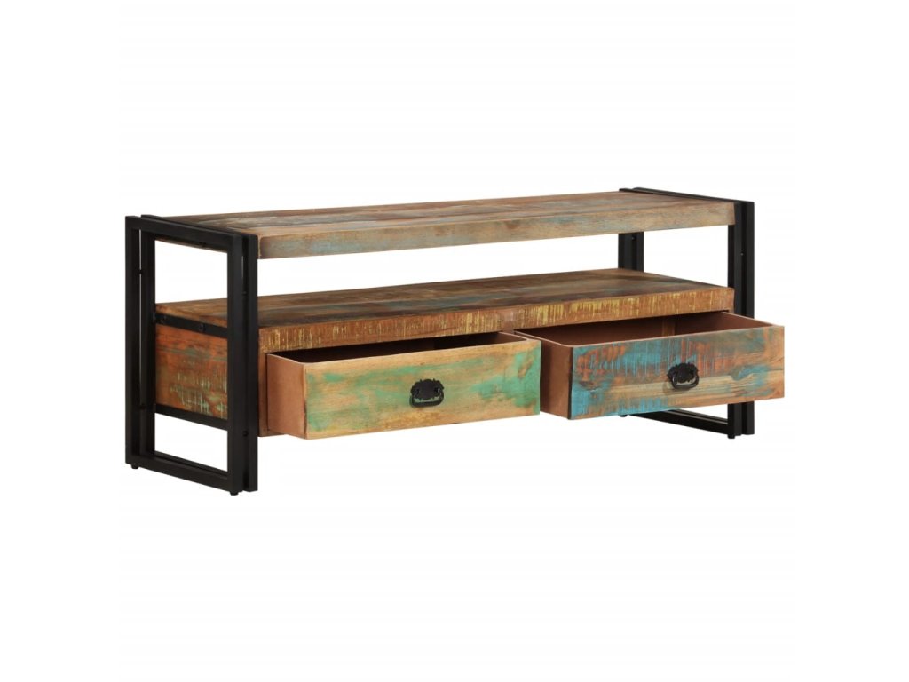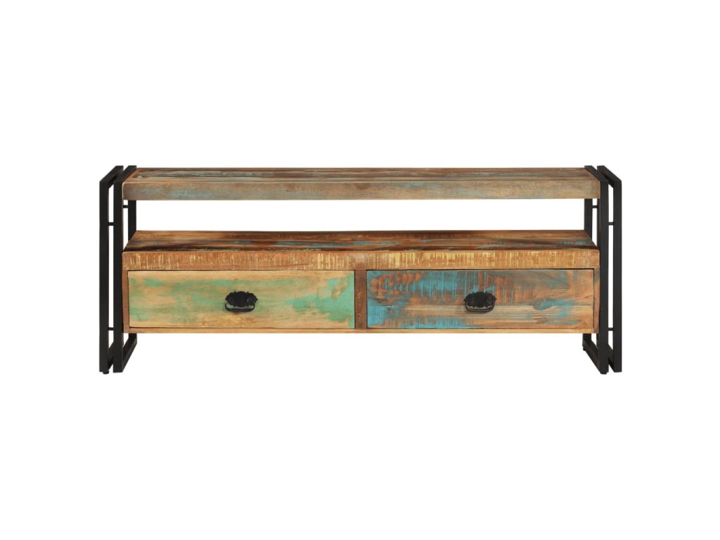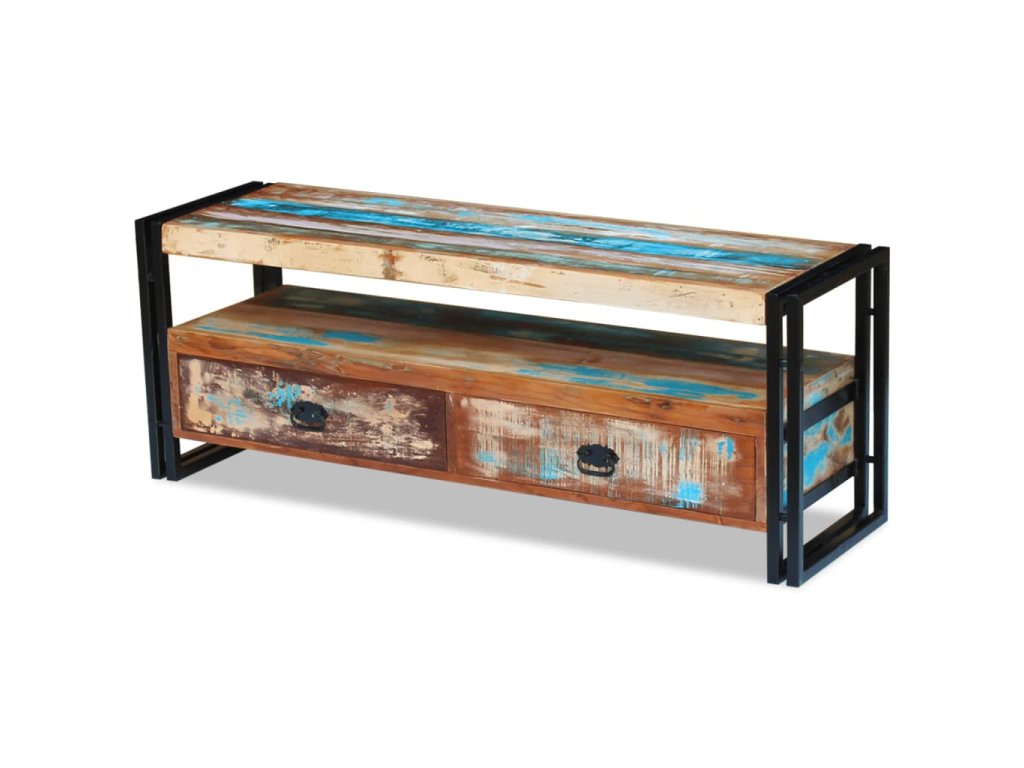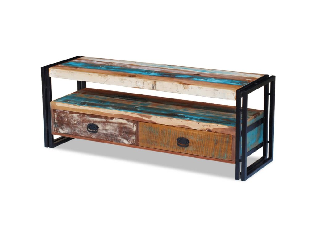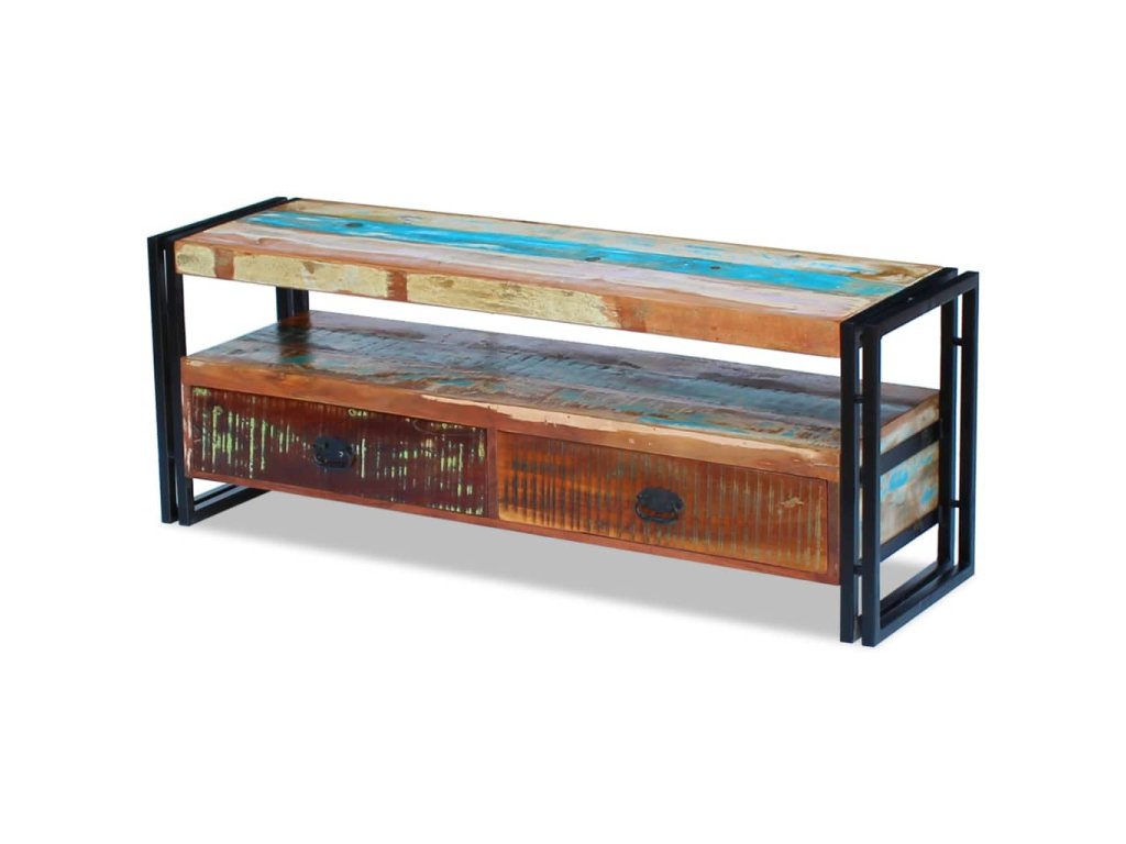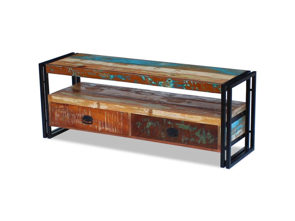 Tento TV stolek se dvěma zásuvkami je vyroben z masivního recyklovaného dřeva a vyzařuje vintage šarm, takže bude stylovým doplňkem do vašeho interiéru. Odlišnosti ve struktuře a barvě dřeva dávají tomuto kusu nábytku jedinečný charakter. Může být používán také jako odkládací stolek, stojan na hi-fi apod.