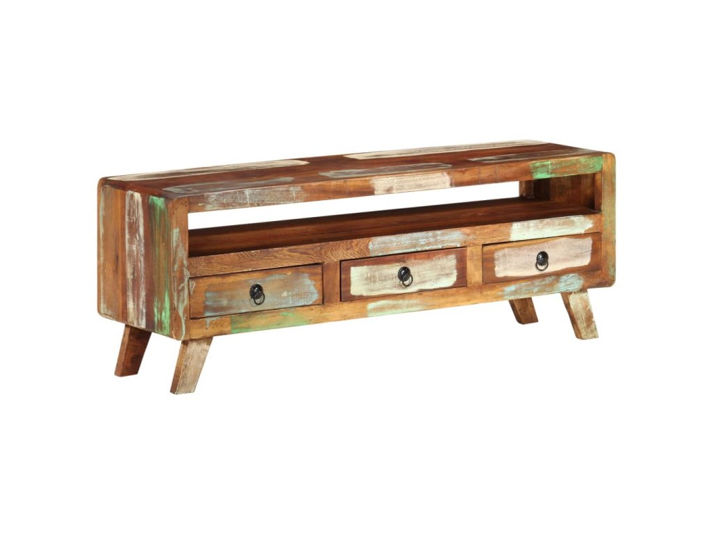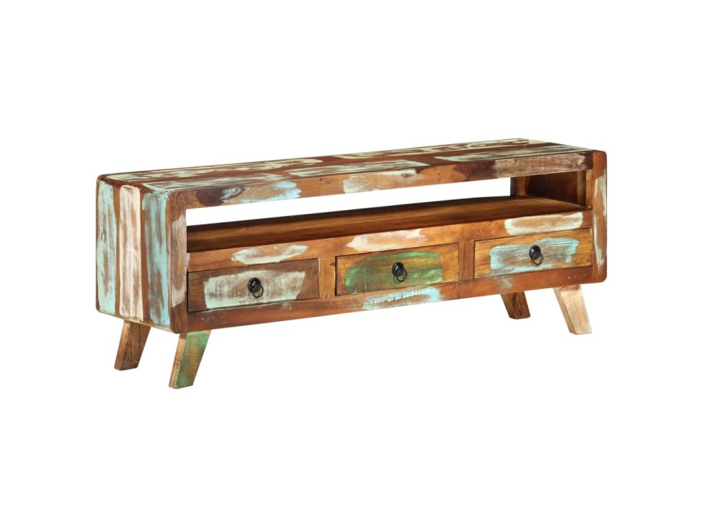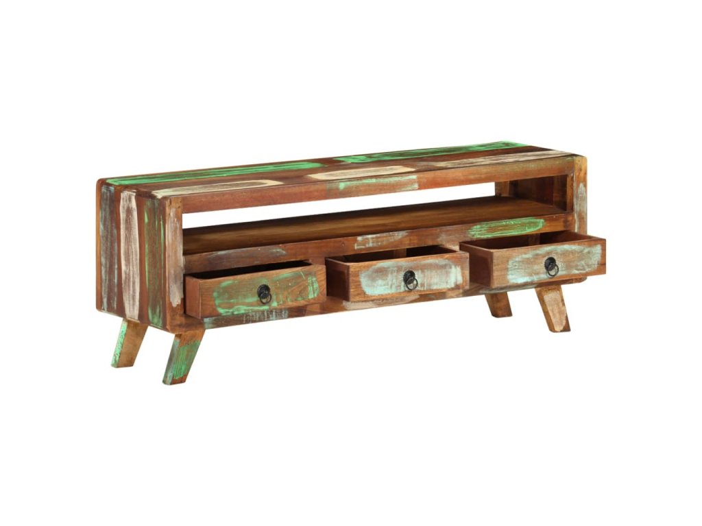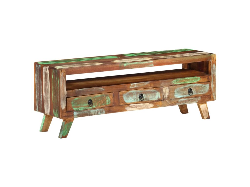 TV stolek je vyroben z masivního recyklovaného dřeva, a to ze směsi různých typů dřevin, mezi něž patří teak, mangovník, borovice, buk a další. Použité dřevo pochází ze starých továren, kůlen a lodí a představuje fantastický materiál pro výrobu nábytku, který je šetrný k životnímu prostředí. Jelikož je každý kus vyrobený ručně, barevně se liší a narazíte na mnoho odstínů modré, zelené, krémové a občas také oranžové, červené a růžové. To znamená, že každý kus je naprosto jedinečný! Navíc je vybaven 3 zásuvkami a 1 policí, které poskytují dostatek úložného prostoru pro vaše osobní věci.