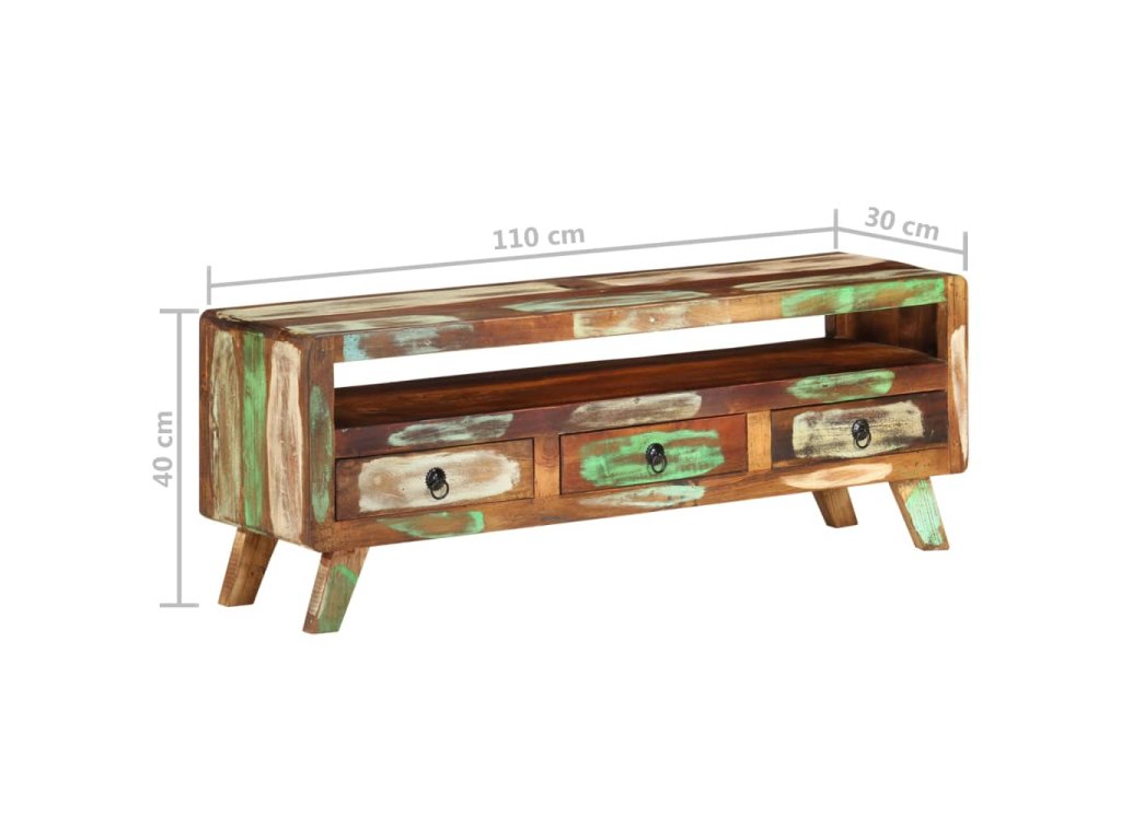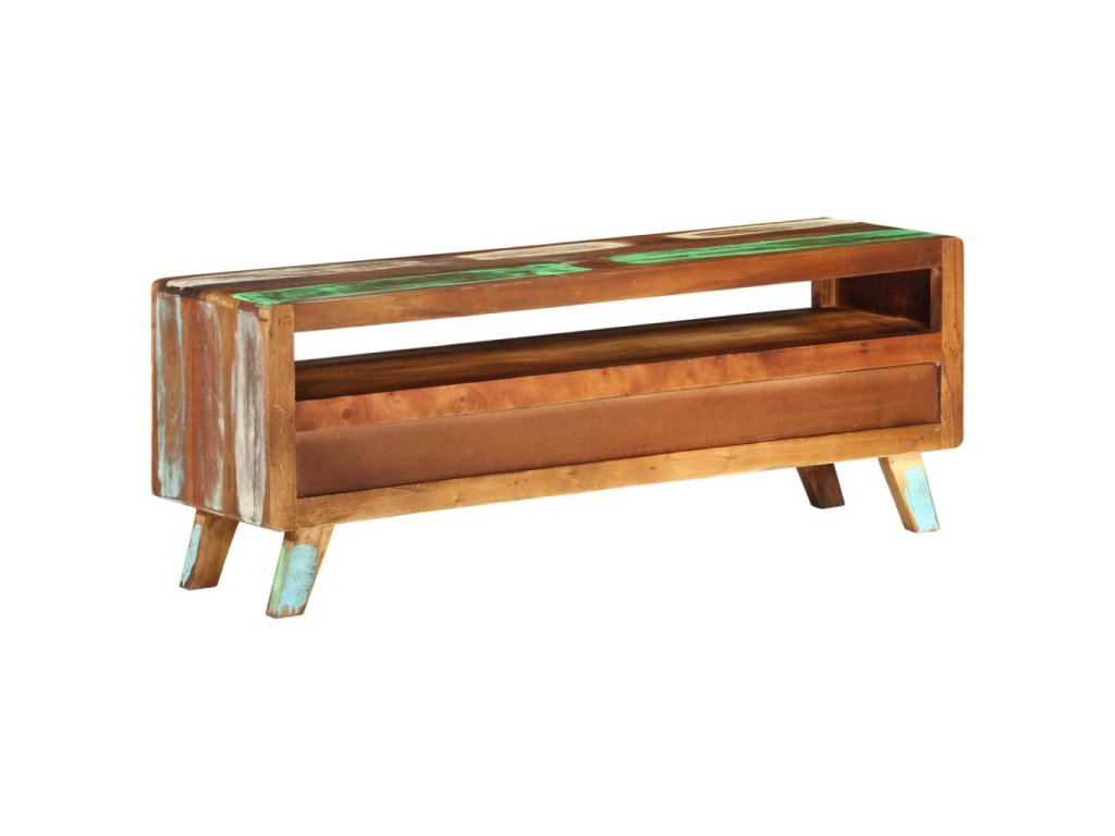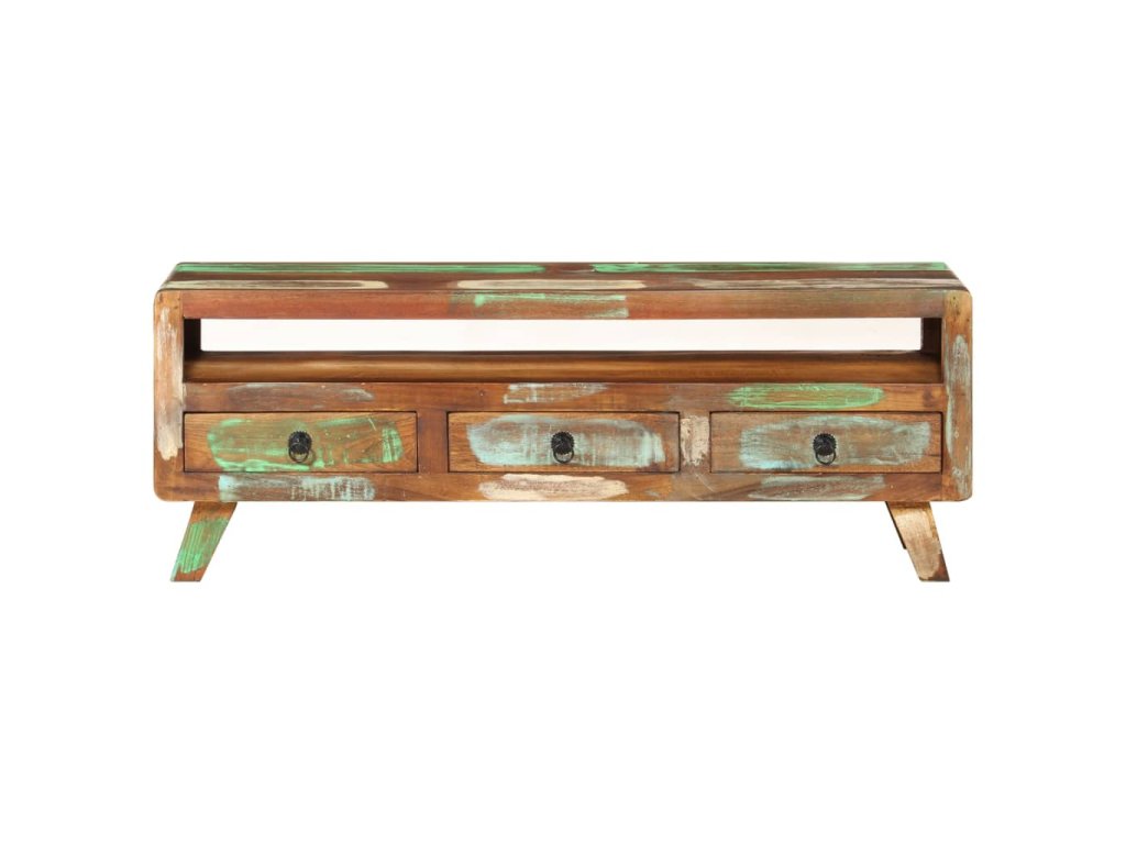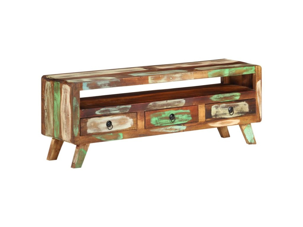 TV stolek je vyroben z masivního recyklovaného dřeva, a to ze směsi různých typů dřevin, mezi něž patří teak, mangovník, borovice, buk a další. Použité dřevo pochází ze starých továren, kůlen a lodí a představuje fantastický materiál pro výrobu nábytku, který je šetrný k životnímu prostředí. Jelikož je každý kus vyrobený ručně, barevně se liší a narazíte na mnoho odstínů modré, zelené, krémové a občas také oranžové, červené a růžové. To znamená, že každý kus je naprosto jedinečný! Navíc je vybaven 3 zásuvkami a 1 policí, které poskytují dostatek úložného prostoru pro vaše osobní věci.