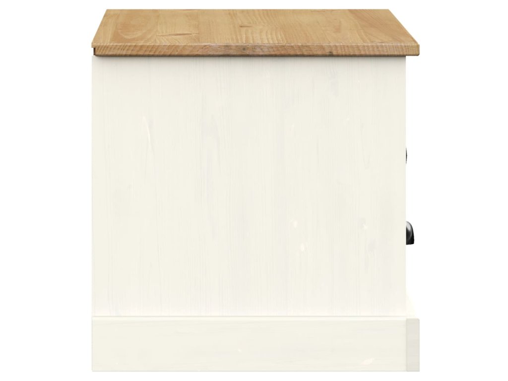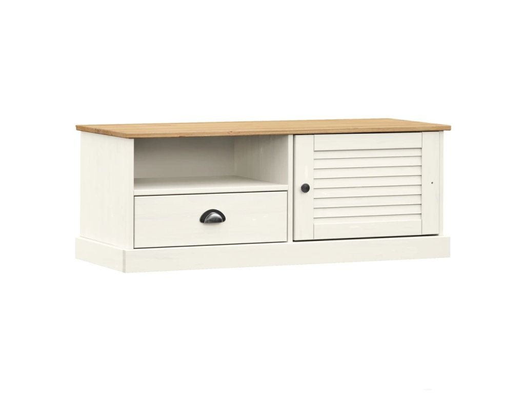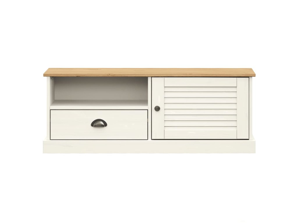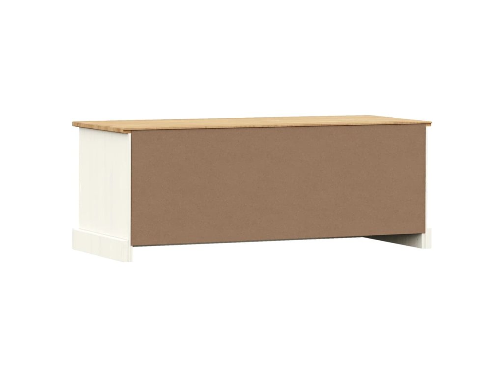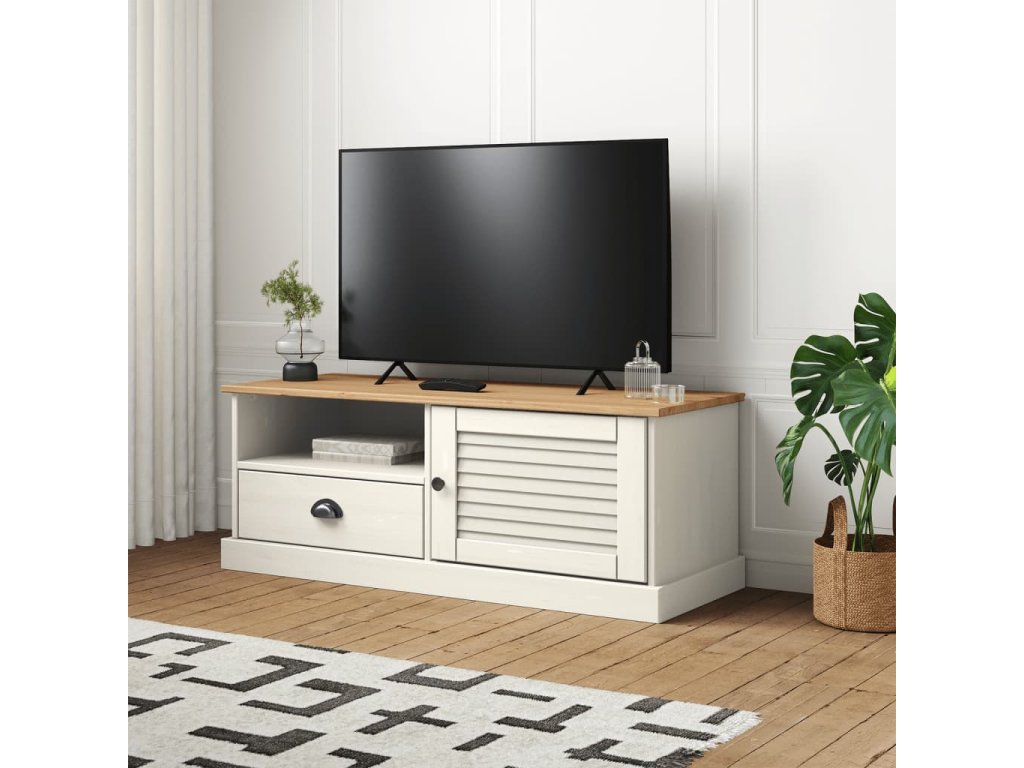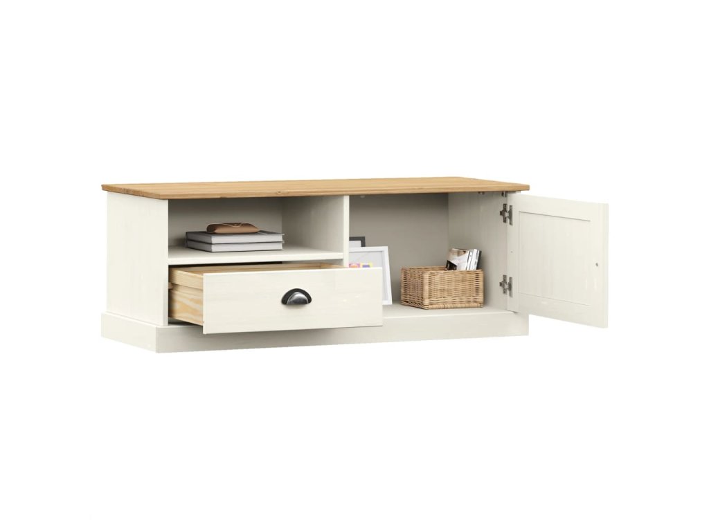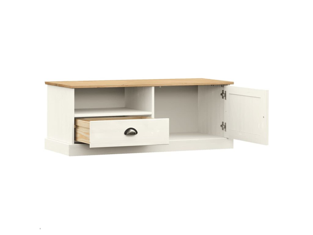 - Masivní borové dřevo: Masivní borové dřevo je krásný přírodní materiál. Borové dřevo má rovnou kresbu a obsahuje suky, které materiálu dodávají jeho charakteristický, rustikální vzhled. Televizní stolek je vyroben z masivního borového dřeva, je tedy odolný a robustní.