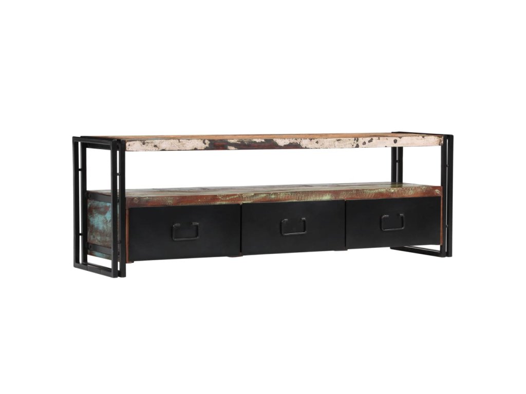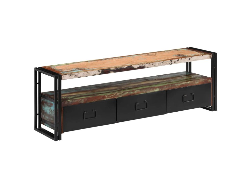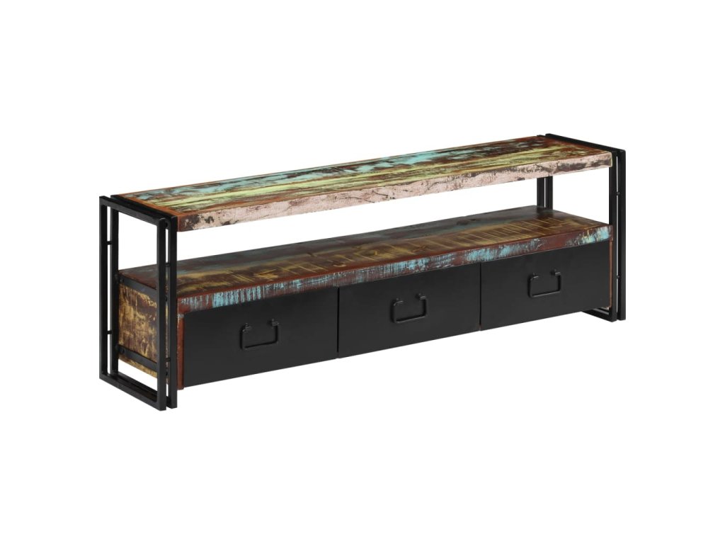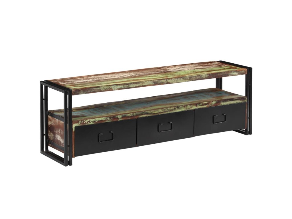 Stolek na multimediální zařízení je zhotovený z masivního recyklovaného dřeva, které pochází z trámů, podlah a podpěrných nosníků ze starých budov určených k demolici a může obsahovat celou řadu různých typů dřeva, jako je borovice, teak, buk, dub, cedr, mangovník, akácie apod. Recyklované dřevo tak získalo vlastnosti všech těchto rozličných druhů dřevin. Recyklované dřevo je již zestárlé, ošlehané a vyschlé, takže se nesmršťuje ani neohýbá. Překrásná kresba dřeva činí každý kus nábytku zcela jedinečným a lehce odlišným od všech ostatních. Známky opotřebení a zřetelná struktura dřeva navíc vypovídají o bohaté historii každého příborníku a dodávají mu unikátní vzhled. Každá fáze výrobního procesu je prováděna s největší pečlivostí, ať se jedná o leštění, natírání anebo lakování. TV stolek disponuje 3 zásuvkami, kam si můžete ukládat všelijaké maličkosti, a 1 přihrádkou pro multimediální zařízení, herní konzole a časopisy. Ocelové nohy nejen přispívají k bytelnosti a stabilitě stolku, ale podtrhují také jeho industriální styl. Výrobek je již sestaven; další montáž není nutná.