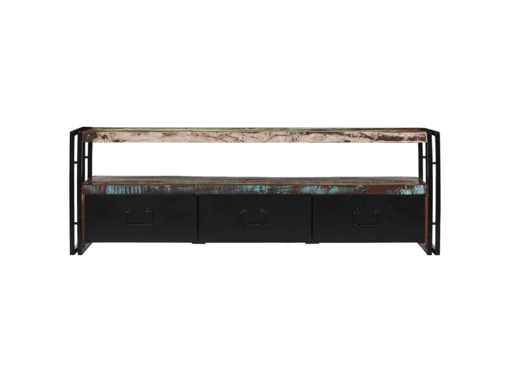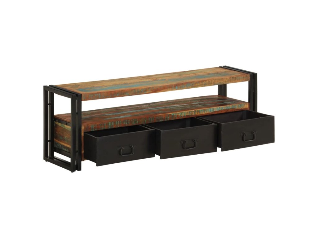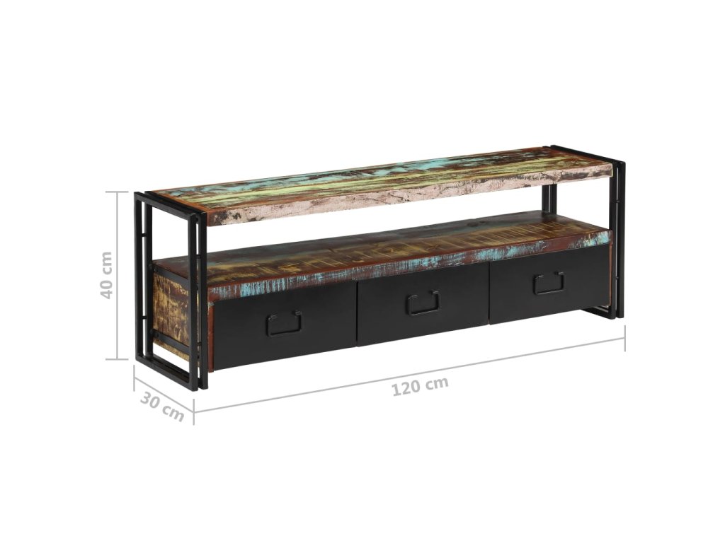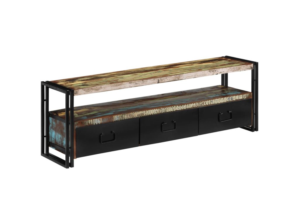 Stolek na multimediální zařízení je zhotovený z masivního recyklovaného dřeva, které pochází z trámů, podlah a podpěrných nosníků ze starých budov určených k demolici a může obsahovat celou řadu různých typů dřeva, jako je borovice, teak, buk, dub, cedr, mangovník, akácie apod. Recyklované dřevo tak získalo vlastnosti všech těchto rozličných druhů dřevin. Recyklované dřevo je již zestárlé, ošlehané a vyschlé, takže se nesmršťuje ani neohýbá. Překrásná kresba dřeva činí každý kus nábytku zcela jedinečným a lehce odlišným od všech ostatních. Známky opotřebení a zřetelná struktura dřeva navíc vypovídají o bohaté historii každého příborníku a dodávají mu unikátní vzhled. Každá fáze výrobního procesu je prováděna s největší pečlivostí, ať se jedná o leštění, natírání anebo lakování. TV stolek disponuje 3 zásuvkami, kam si můžete ukládat všelijaké maličkosti, a 1 přihrádkou pro multimediální zařízení, herní konzole a časopisy. Ocelové nohy nejen přispívají k bytelnosti a stabilitě stolku, ale podtrhují také jeho industriální styl. Výrobek je již sestaven; další montáž není nutná.