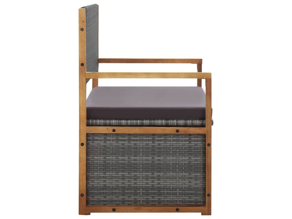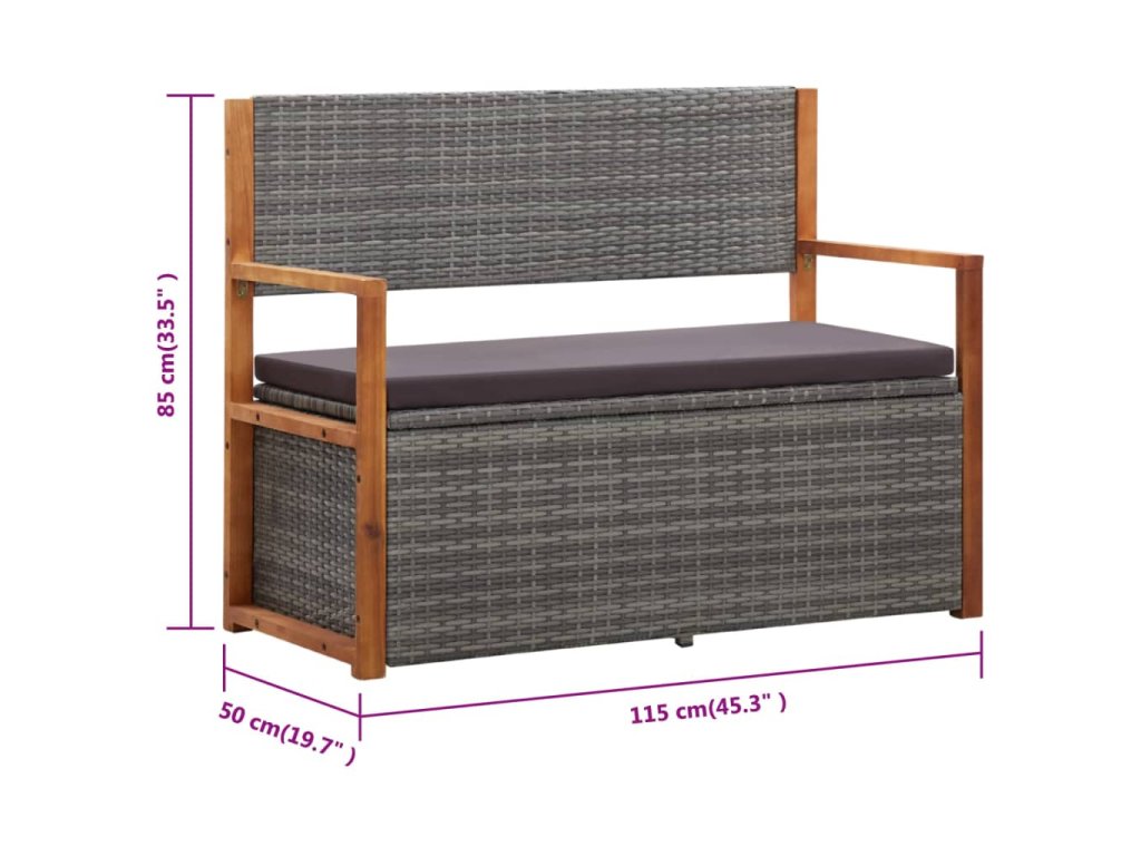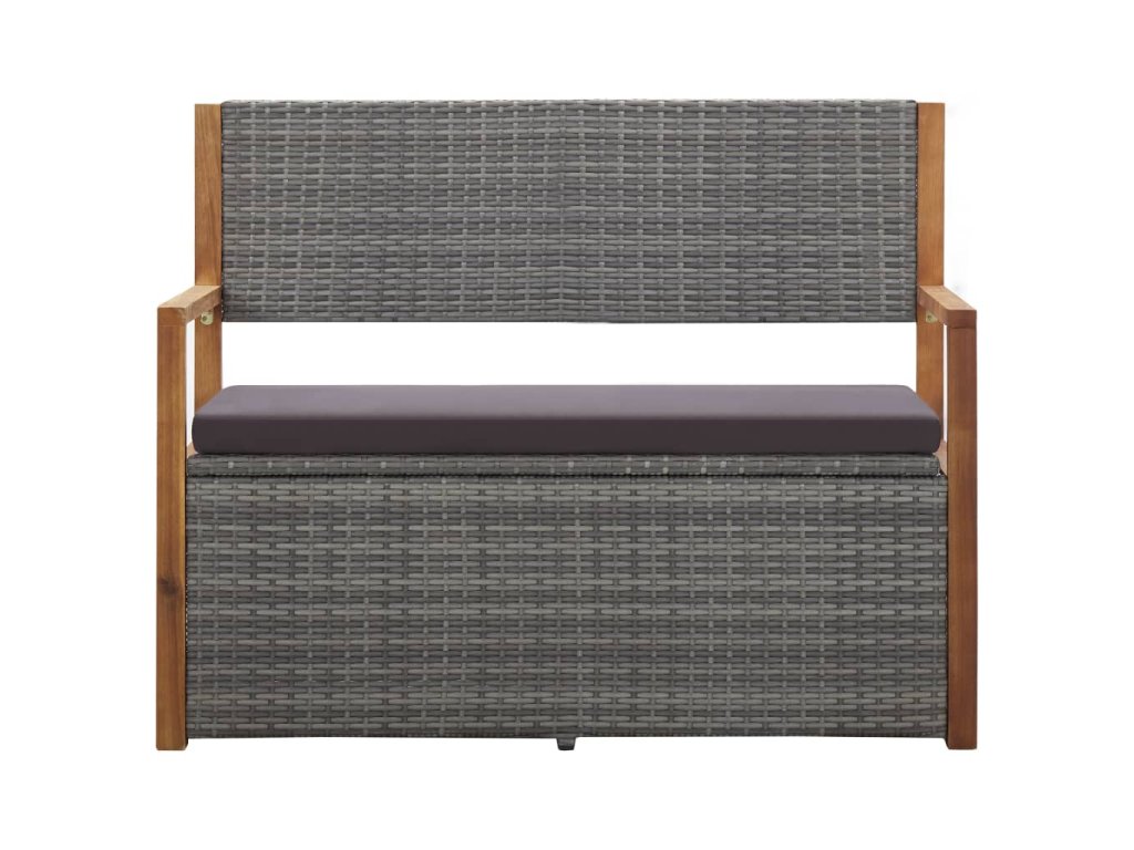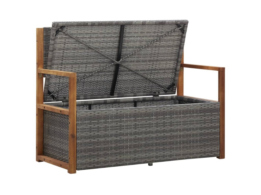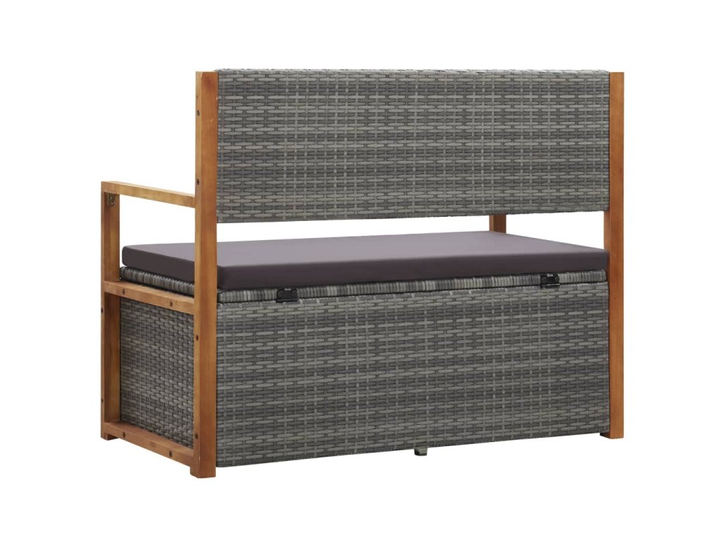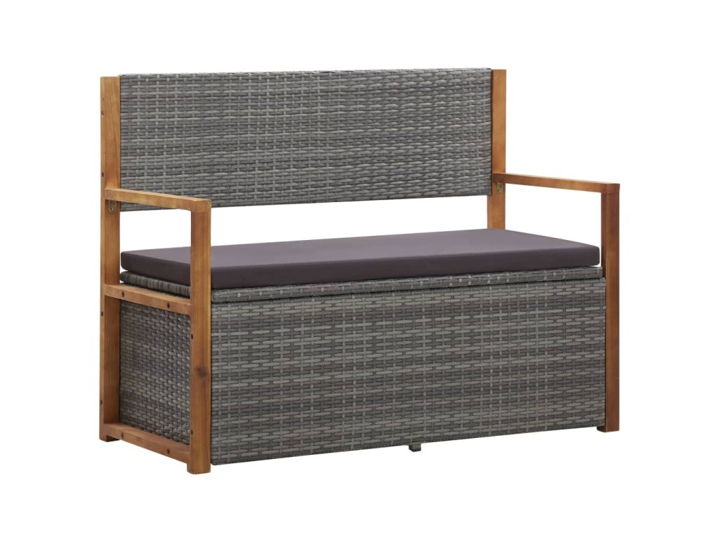 Zahradní lavice je zhotovená z polyratanu a masivního akáciového dřeva, které je odolné, nerezaví a skvěle vzdoruje rozmarům počasí. Jedná se tedy o perfektní volbu pro dlouhá léta spokojeného používání. Lavice uvnitř disponuje prostornou úložnou přihrádkou, kde si můžete přehledně uschovat celou řadu věcí na dosah ruky. Tlustá snímatelná poduška na sedák je velmi pohodlná.