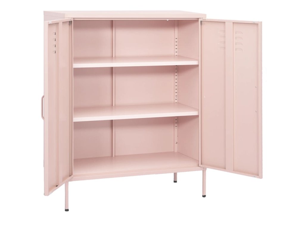 Tato odkládací skříňka s ocelovou konstrukcí je pevná a odolná. Pomocí nožek můžete nastavit výšku podle vašich potřeb. Příborník má 2 dvířka, za kterými najdete nastavitelné police, takže se do nich vejdou předměty různých velikostí, jako jsou knihy, časopisy a další osobní nezbytnosti.