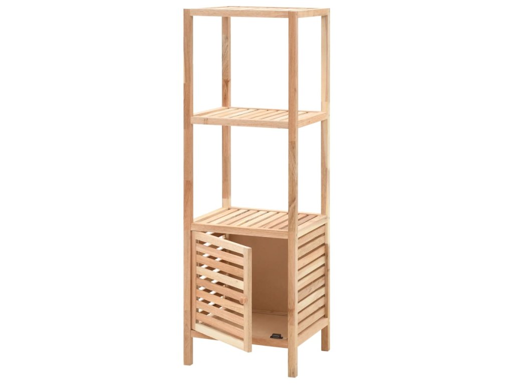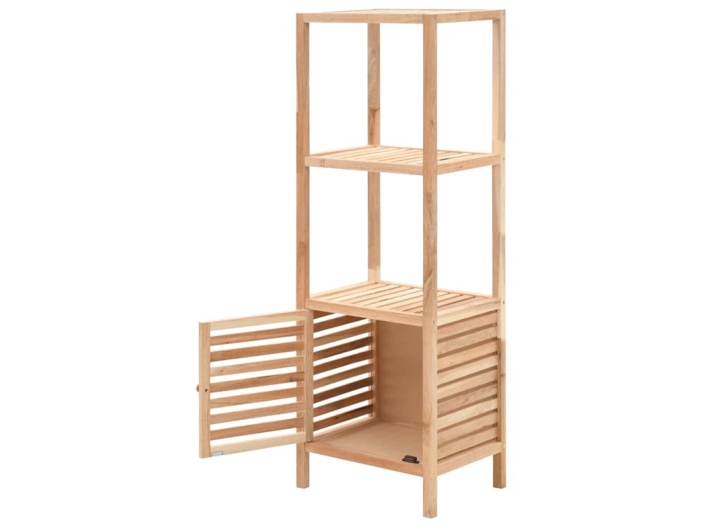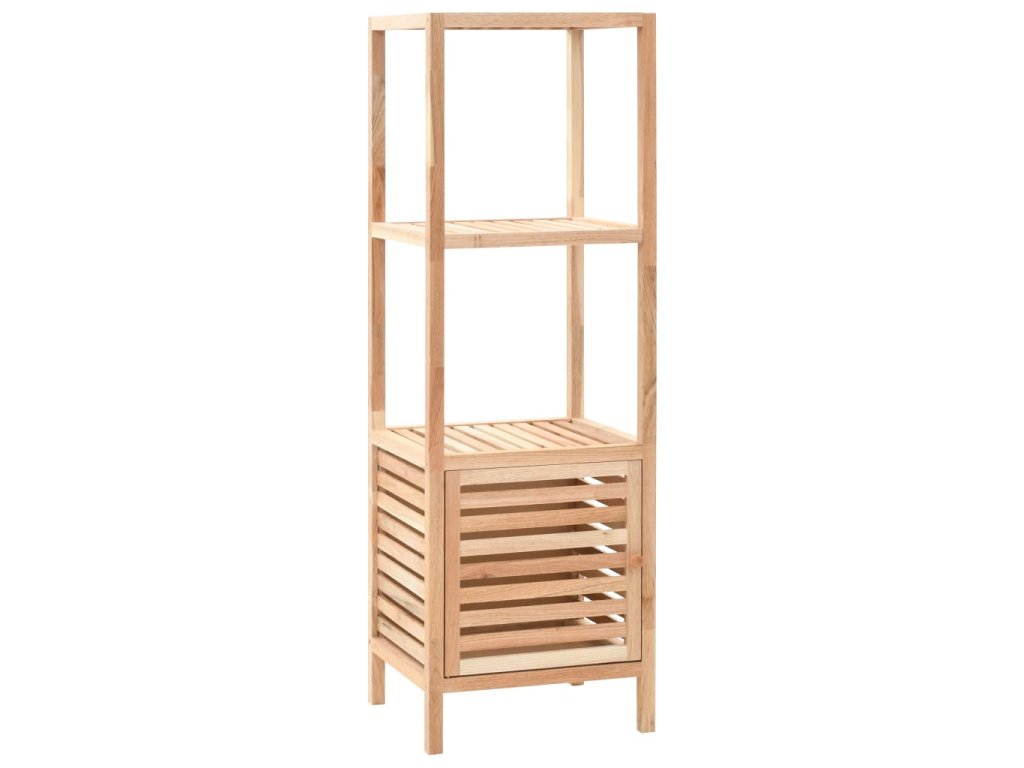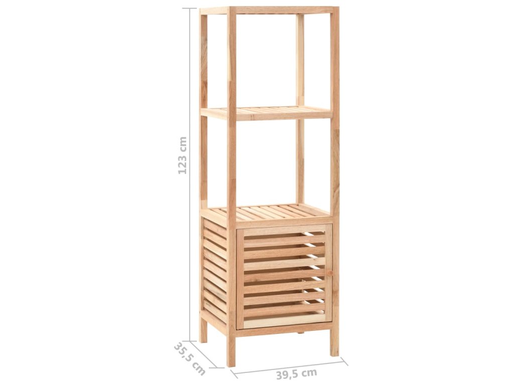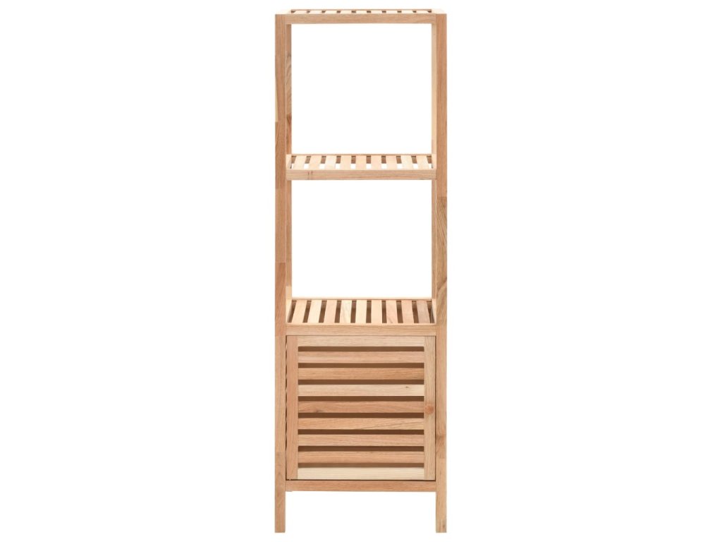 Oživte svou koupelnu či jiný pokoj přírodním designem naší dřevěné úložné skříňky! Je vyrobena z masivního ořechového dřeva a překližky, takže je nejen pevná a odolná, ale zároveň také krásně vypadá. Úložný regál se 3 poličkami disponuje skříňkou s laťkovými dvířky, takže jsou vaše potřeby přehledně uspořádané a přitom dobře větrané.