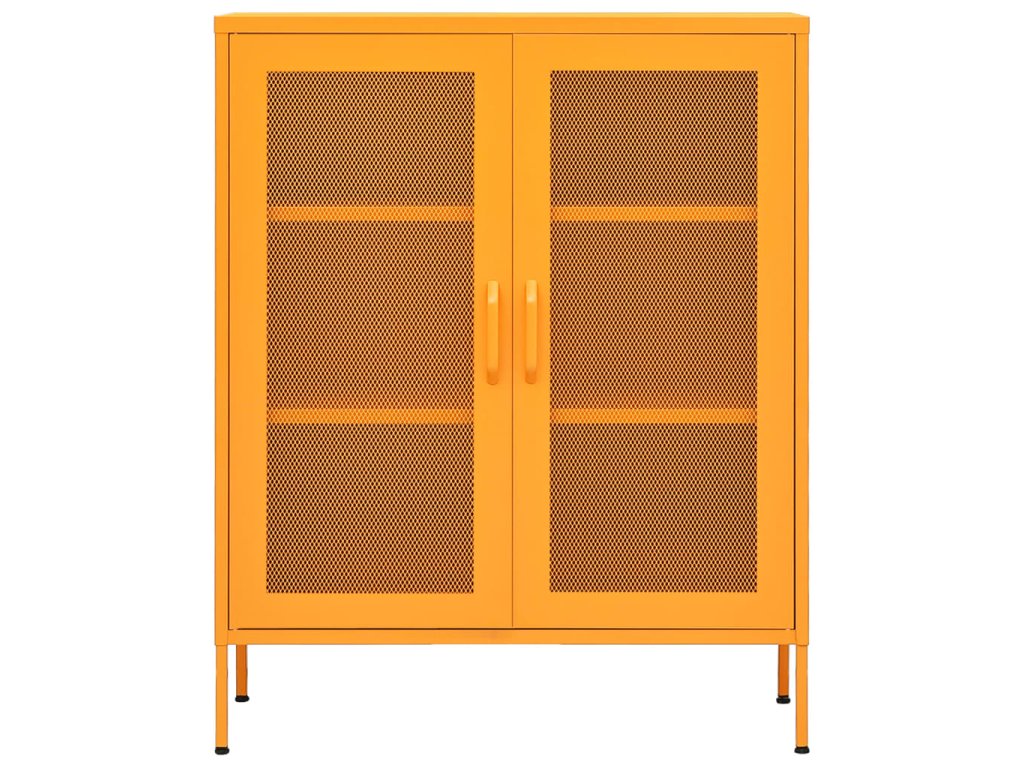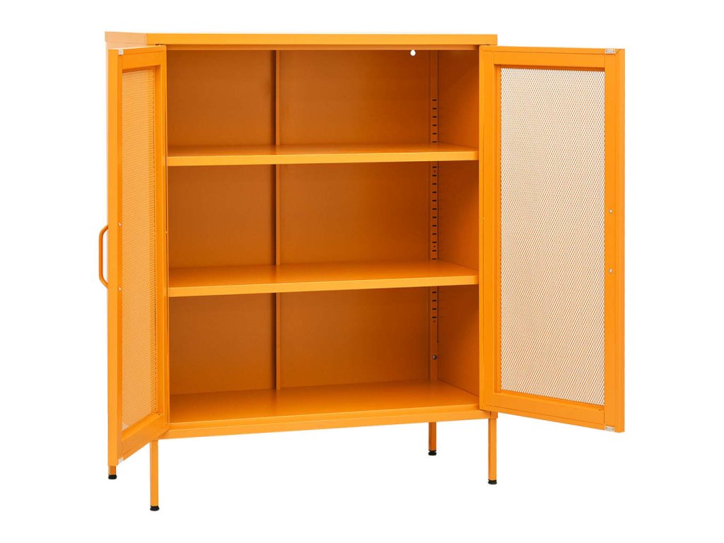 Tato odkládací skříňka s ocelovou konstrukcí je pevná a odolná. Pomocí nožek můžete nastavit výšku podle vašich potřeb. Příborník má 2 dvířka s mřížovým designem, za kterými najdete nastavitelné police, takže se do nich vejdou předměty různých velikostí, jako jsou knihy, časopisy a další osobní nezbytnosti.