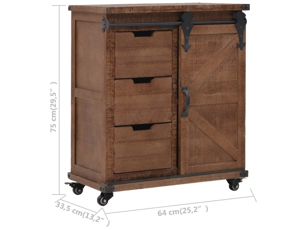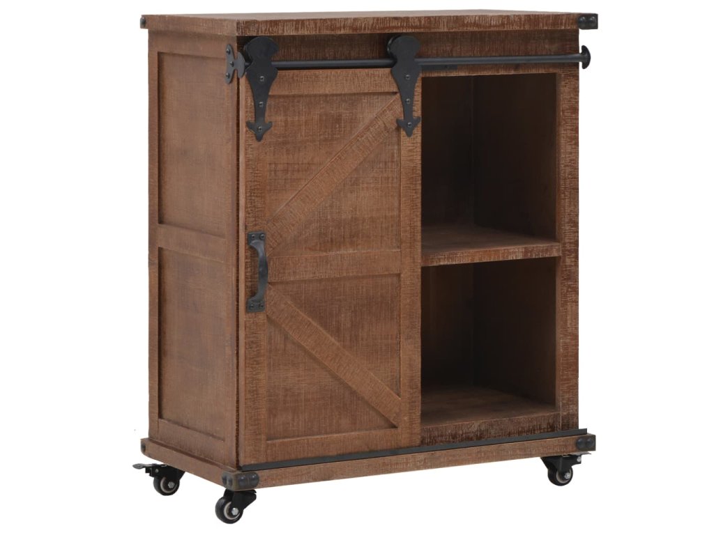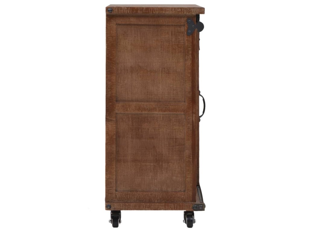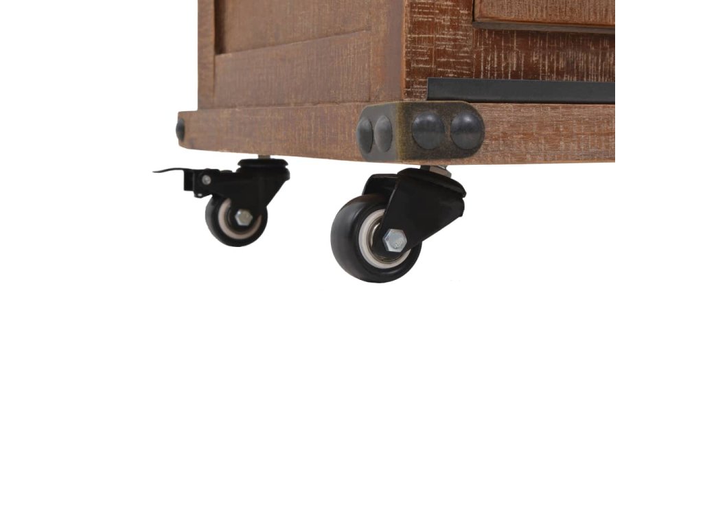 Tato vysoce stabilní a odolná skříňka je vyrobená z masivního jedlového dřeva, jež vyzařuje půvabné vintage kouzlo a dodává jí rustikální rysy. Skříňka poskytuje dostatek úložného prostoru pro úhledné uspořádání různých předmětů. Jedinečný posuvný design umožňuje snadné otevírání a zavírání dvířek a zároveň podtrhuje industriální vintage styl skříňky. Dřevěná skříňka je vybavena čtyřmi flexibilními kolečky, můžete ji tedy bez obtíží přesouvat po celém domě.