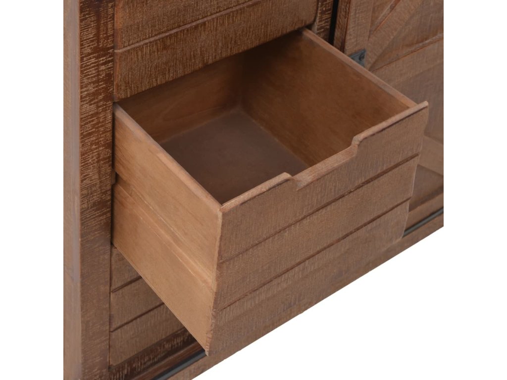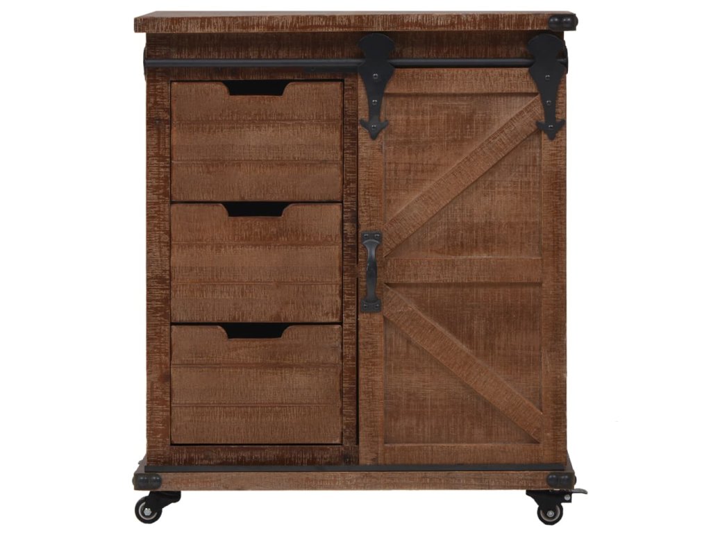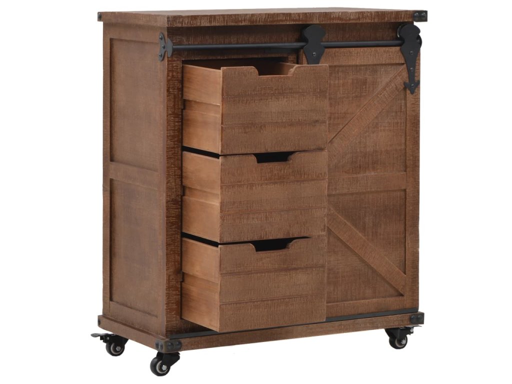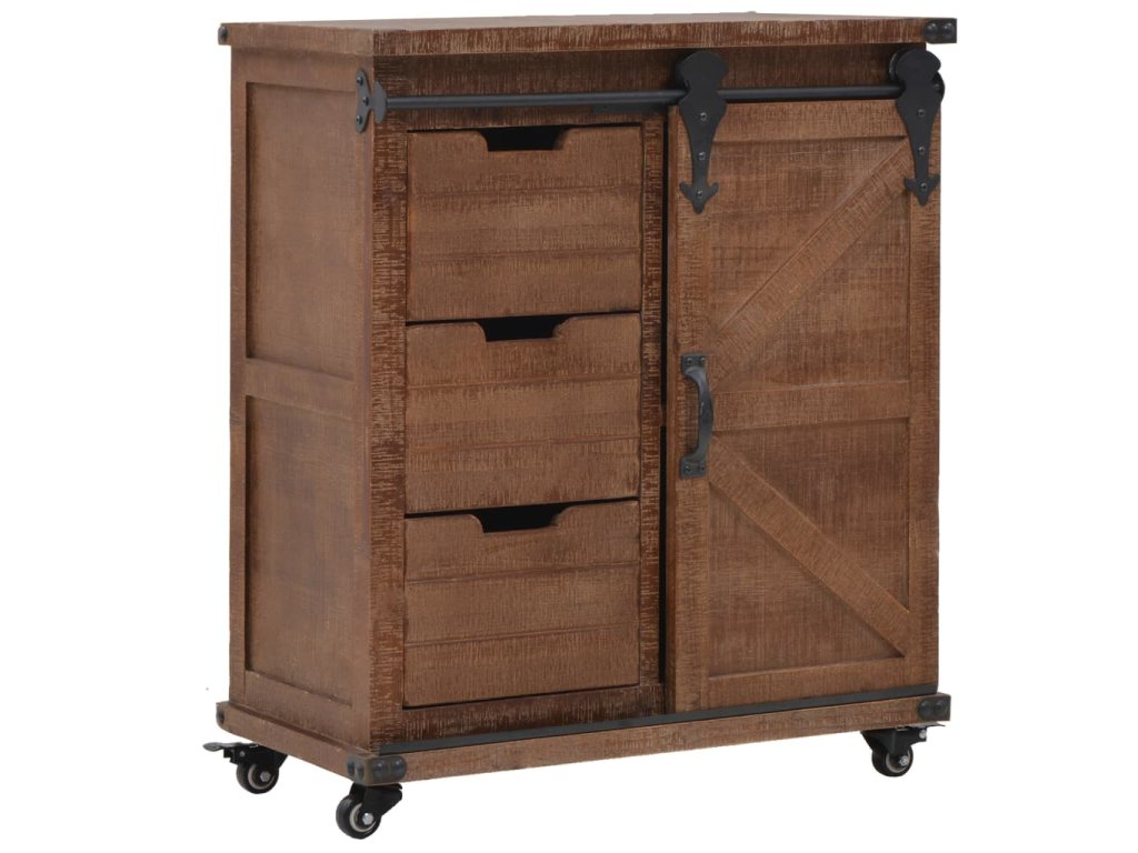 Tato vysoce stabilní a odolná skříňka je vyrobená z masivního jedlového dřeva, jež vyzařuje půvabné vintage kouzlo a dodává jí rustikální rysy. Skříňka poskytuje dostatek úložného prostoru pro úhledné uspořádání různých předmětů. Jedinečný posuvný design umožňuje snadné otevírání a zavírání dvířek a zároveň podtrhuje industriální vintage styl skříňky. Dřevěná skříňka je vybavena čtyřmi flexibilními kolečky, můžete ji tedy bez obtíží přesouvat po celém domě.