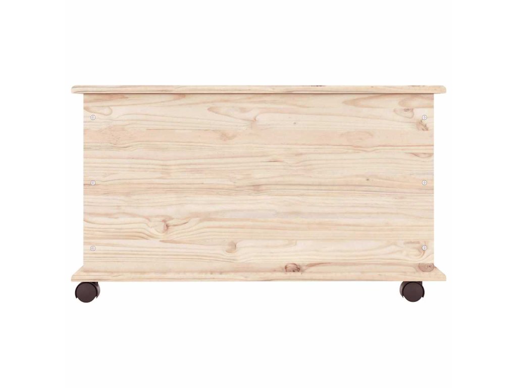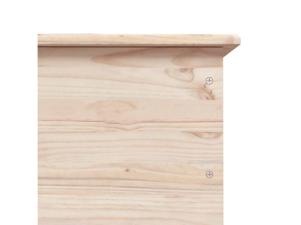 - Masivní borové dřevo: Masivní borové dřevo je krásný přírodní materiál. Borové dřevo má rovnou kresbu a obsahuje suky, které materiálu dodávají jeho charakteristický, rustikální vzhled. Truhla je vyrobena z masivního borového dřeva, je tedy odolná a robustní.