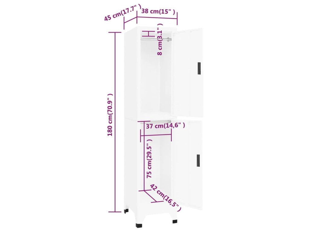 Úložná skříňka je vyrobena z oceli, proto má dlouhou životnost a snadno se čistí. Každá přihrádka je vybavena věšákem a uzamykatelnými dvířky s větracími otvory. Skříň má dostatek úložného prostoru pro bezpečné uložení oblečení a dalších osobních věcí. Držáky na štítky a větrací otvory umožňují přehledně třídit vaše položky. Tato skříň je vhodná do škol a kanceláří k uložení různých věcí.