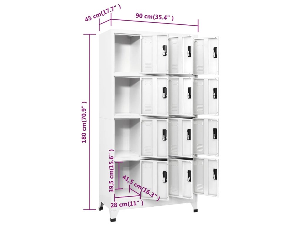 Úložná skříňka je vyrobena z oceli, proto má dlouhou životnost a snadno se čistí. Každá přihrádka je vybavena uzamykatelnými dvířky s větracími otvory. Skříň má dostatek úložného prostoru pro bezpečné uložení oblečení a dalších osobních věcí. Držáky na štítky umožňují přehledně třídit vaše položky. Tato skříň je vhodná do škol a kanceláří k uložení nejrůznějších věcí.