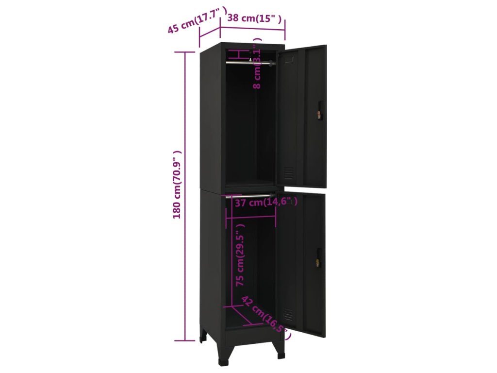 Úložná skříňka je vyrobena z oceli, proto má dlouhou životnost a snadno se čistí. Každá přihrádka je vybavena věšákem a uzamykatelnými dvířky s větracími otvory. Skříň má dostatek úložného prostoru pro bezpečné uložení oblečení a dalších osobních věcí. Držáky na štítky a větrací otvory umožňují přehledně třídit vaše položky. Tato skříň je vhodná do škol a kanceláří k uložení různých věcí.