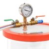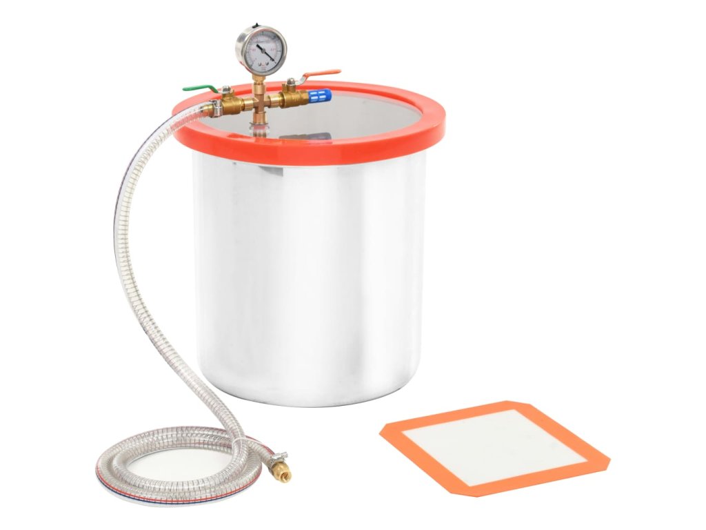 Odplyňovací komora je dobře utěsněná, aby se zabránilo jakémukoli úniku, a představuje bezpečný a spolehlivý prostředek k odplynění. Je vyrobená z nerezové oceli, která je odolná, neopotřebovává se a skvěle odolává tlaku. Mimořádné silné, průhledné akrylové víko se při vakuových procesech nikdy neprohne a umožní vám celý proces odplynění pozorně sledovat. Pro lepší kontrolu je k dispozici také silikonový olejový manometr a otřesuvzdorný vakuový manometr. Ocelová hadice dokáže čelit i vysokému tlaku.