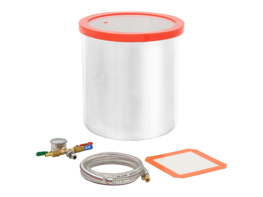 Odplyňovací komora je dobře utěsněná, aby se zabránilo jakémukoli úniku, a představuje bezpečný a spolehlivý prostředek k odplynění. Je vyrobená z nerezové oceli, která je odolná, neopotřebovává se a skvěle odolává tlaku. Mimořádné silné, průhledné akrylové víko se při vakuových procesech nikdy neprohne a umožní vám celý proces odplynění pozorně sledovat. Pro lepší kontrolu je k dispozici také silikonový olejový manometr a otřesuvzdorný vakuový manometr. Ocelová hadice dokáže čelit i vysokému tlaku.