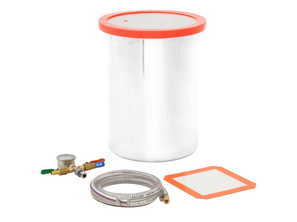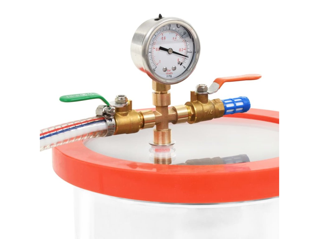 Odplyňovací komora je dobře utěsněná, aby se zabránilo jakémukoli úniku, a představuje bezpečný a spolehlivý prostředek k odplynění. Je vyrobená z nerezové oceli, která je odolná, neopotřebovává se a skvěle odolává tlaku. Mimořádné silné, průhledné akrylové víko se při vakuových procesech nikdy neprohne a umožní vám celý proces odplynění pozorně sledovat. Pro lepší kontrolu je k dispozici také silikonový olejový manometr a otřesuvzdorný vakuový manometr. Ocelová hadice dokáže čelit i vysokému tlaku.