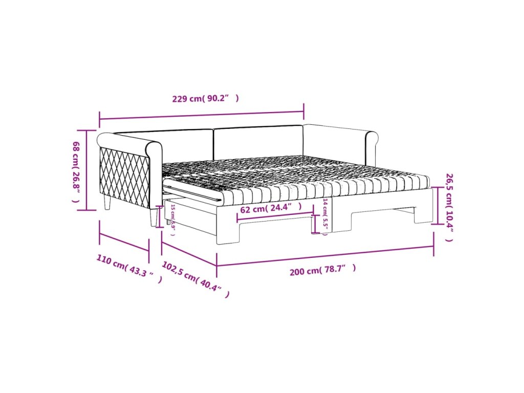 - Rozměry (nevysunuté): 229 x 110 x 68 cm (D x Š x V)