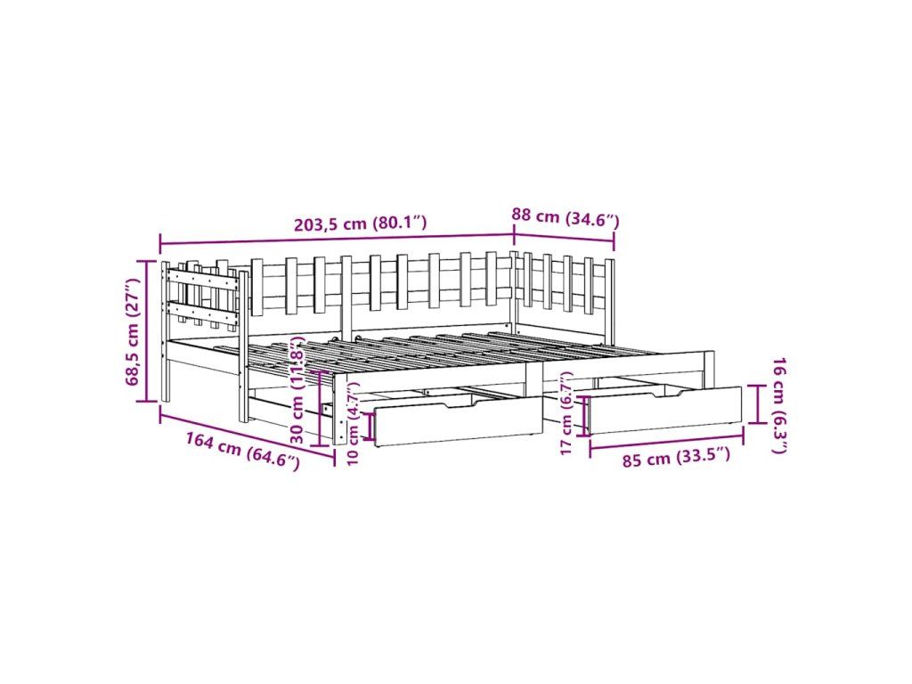 - Rozměry zásuvky pod postel (každá): 85 x 55 x 17 cm (Š x H x V)