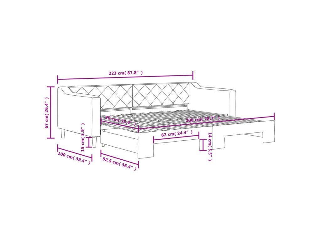 - Rozměry (nevysunuté): 223 x 100 x 67 cm (D x Š x V)