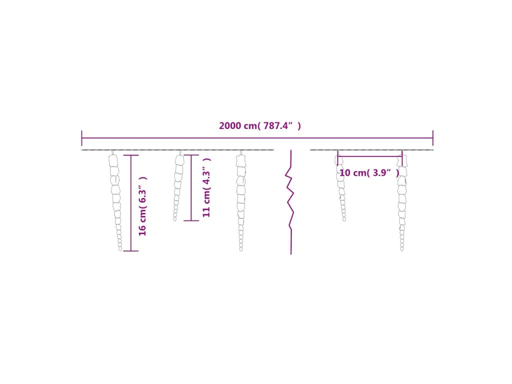 - 200 LED světel ve tvaru rampouchu: Tento světelný řetěz obsahuje celkem 200 energeticky úsporných LED světel ve tvaru rampouchu, které vytvoří magickou světelnou show!