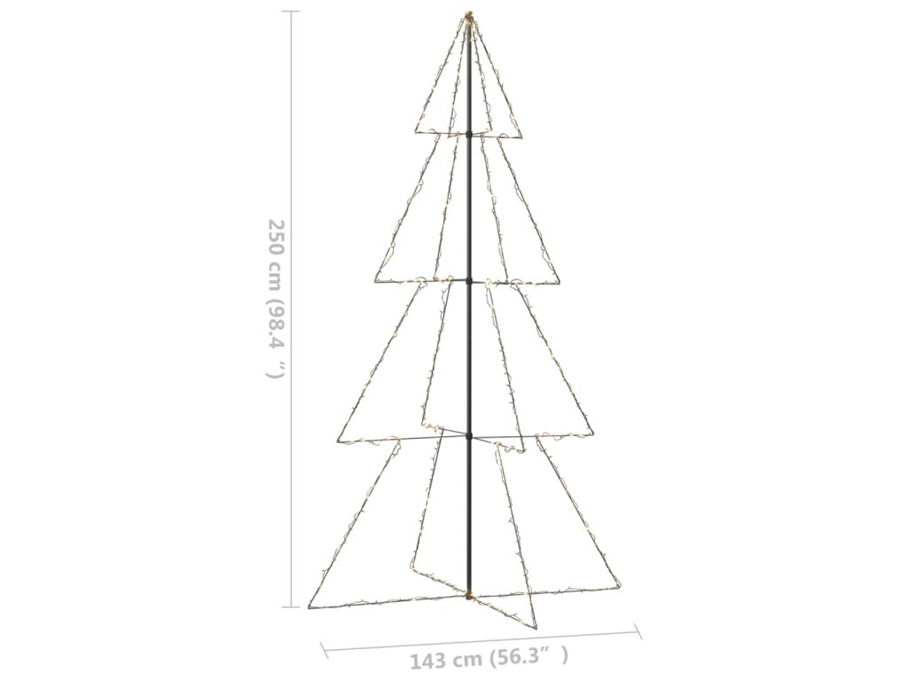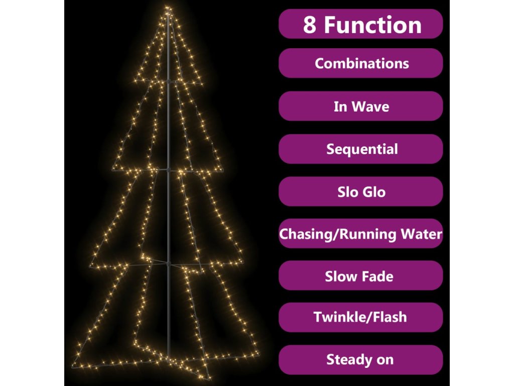 Světýlka obsahují 360 vysoce výkonných LED diod, které jsou velmi energeticky úsporné a vydávají jasné světlo. Diody mají 8 různých světelných režimů: kombinace všech, pomalá záře, blikání/mihotání, svícení ve vlnách, efekt tekoucí vody, sekvenční svícení, stálé svícení a pomalé blednutí. Světla se krásně rozzáří a vytvoří kouzelnou sváteční atmosféru. Bude to opravdová potěcha por oči, obzvláště večer, a také slouží jako útulný zdroj světla v místnosti. Volně stojící kužel lze snadno a bezpečně připevnit k zemi za pomoci přiloženého montážního materiálu.