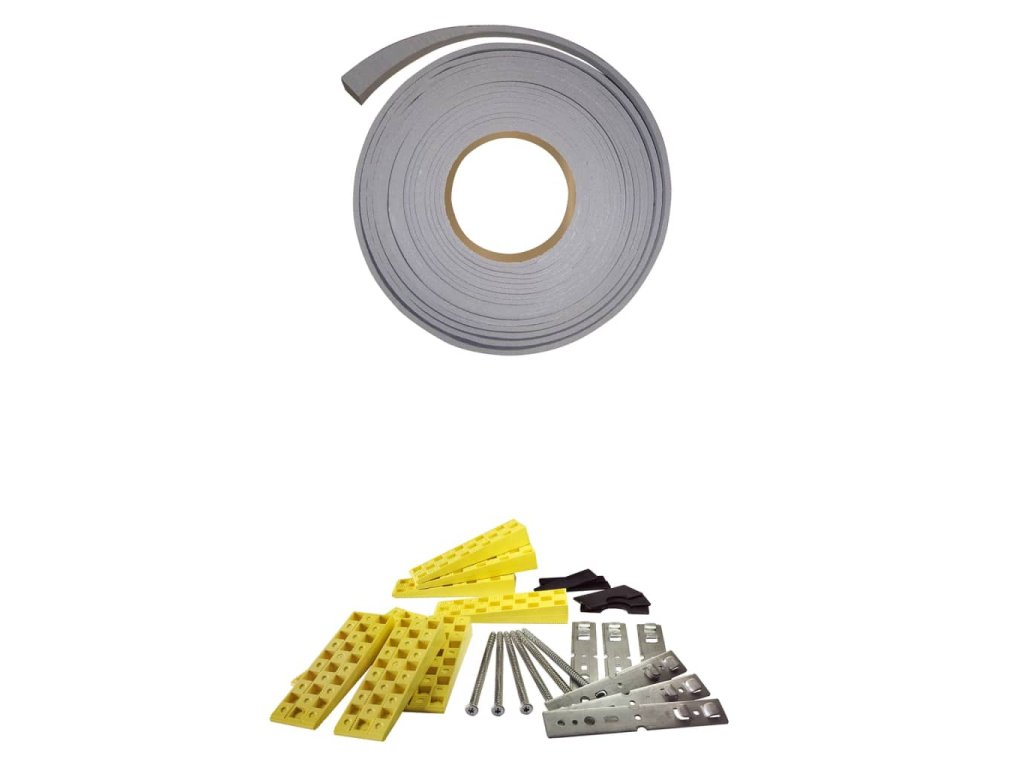 - Dodávka obsahuje 8 plastových klínů, 6 podložek, 6 hmoždinek a 6 kovových hmoždinek (montážních šroubů)