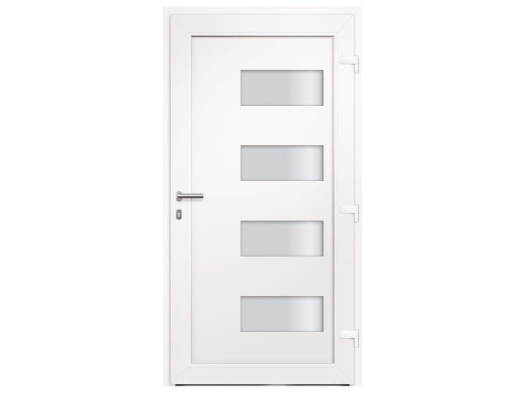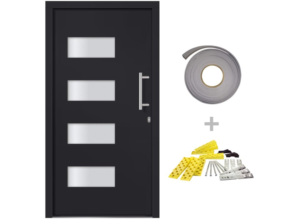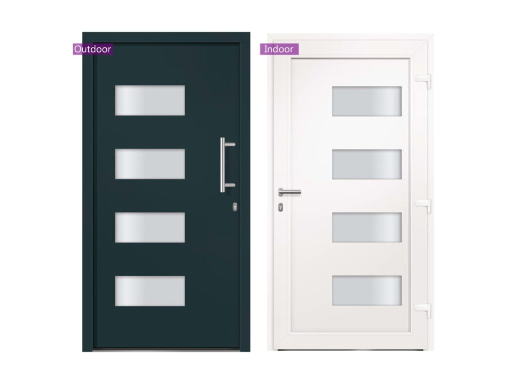 Vchodové dveře mají robustní rám i výplň, hliníkový práh, nastavitelné panty, bezpečnostní zámek s jazýčkem a háčkem a 5 stavítky, izolační zasklení a výztuhou z pozinkované oceli. Samotné dveře jsou vyrobené z hliníku a PVC a vyznačují se svou působivou bytelností a vysoce praktickým zamykáním. Obdržíte je spolu s kompletní sadou, která obsahuje nerezovou úchytku, vnitřní kliku, klíče, těsnící pásku a montážní příslušenství.