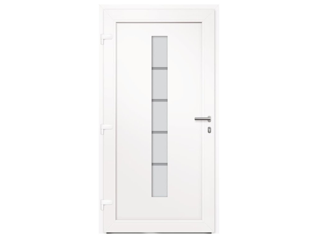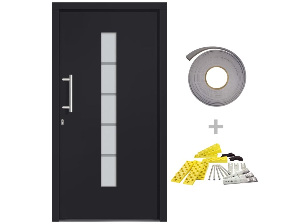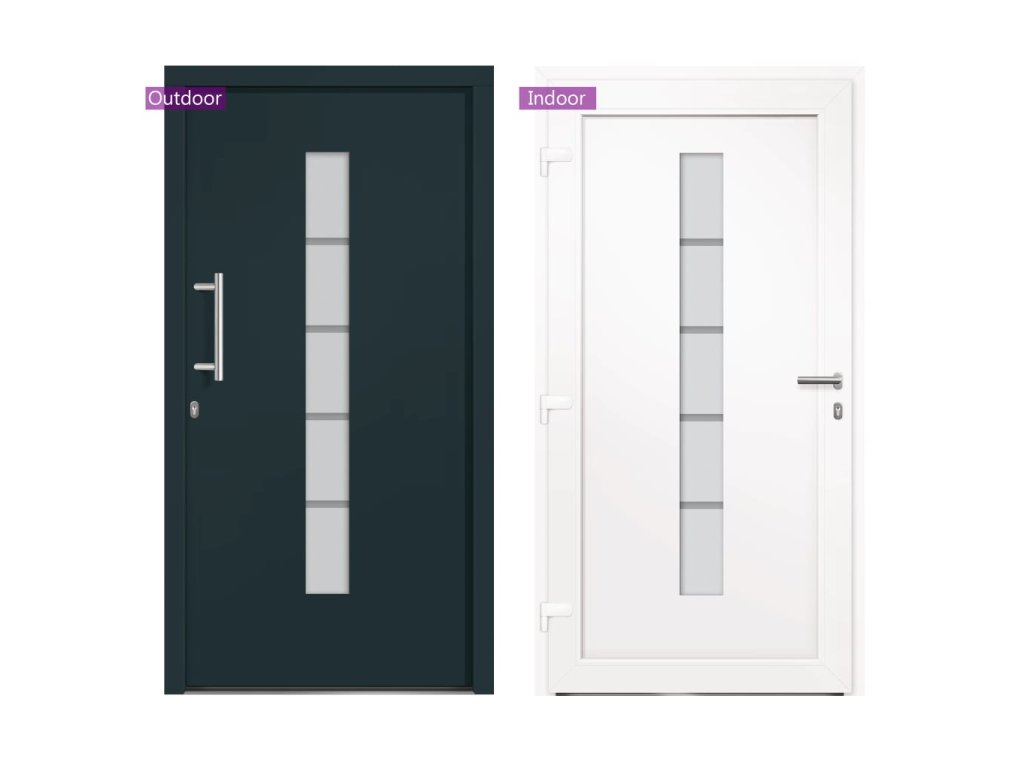 Vchodové dveře mají robustní rám i výplň, hliníkový práh, nastavitelné panty, bezpečnostní zámek s jazýčkem a háčkem a 5 stavítky, izolační zasklení a výztuhou z pozinkované oceli. Samotné dveře jsou vyrobené z hliníku a PVC a vyznačují se svou působivou bytelností a vysoce praktickým zamykáním. Obdržíte je spolu s kompletní sadou, která obsahuje nerezovou úchytku, vnitřní kliku, klíče, těsnící pásku a montážní příslušenství.
