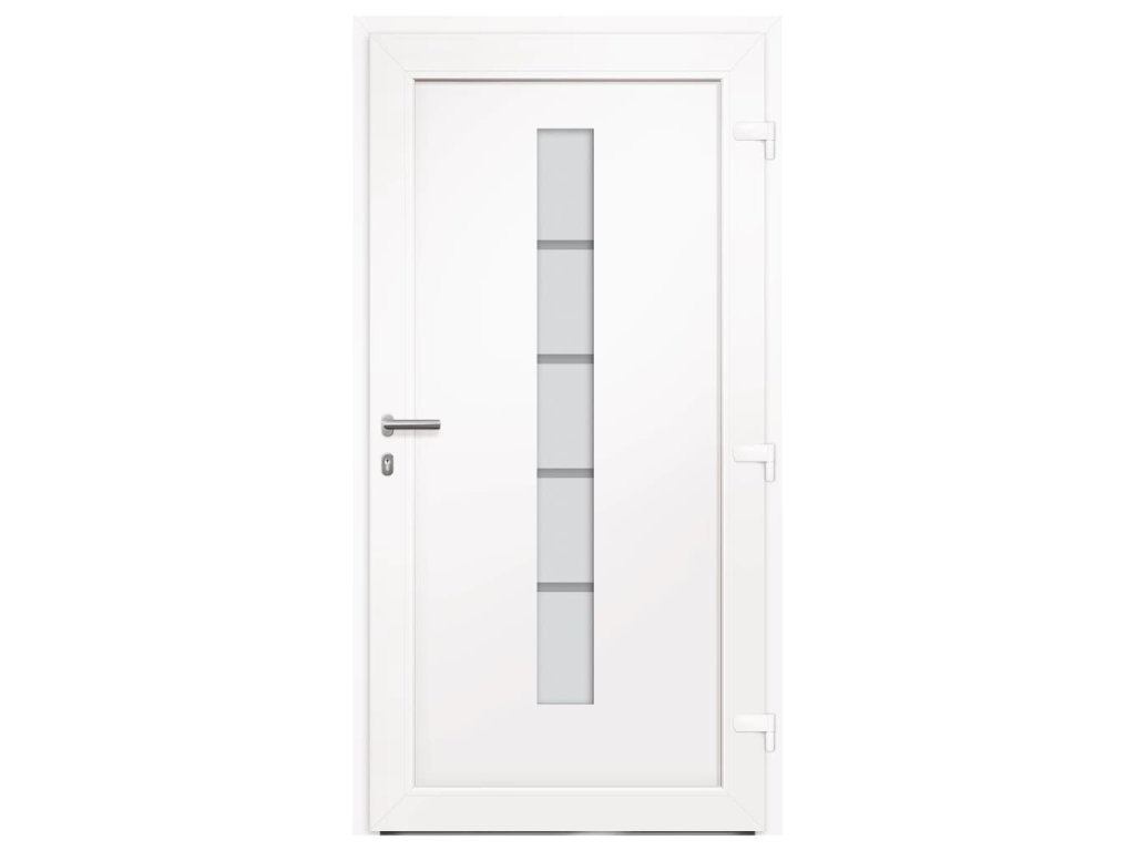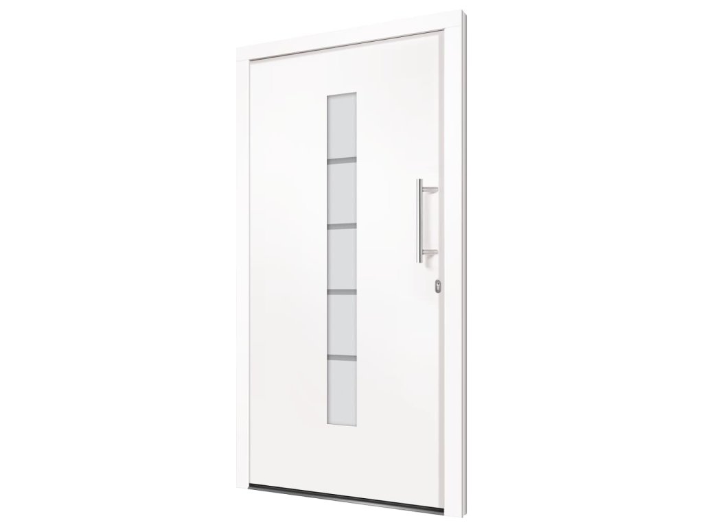 Vchodové dveře mají robustní rám i výplň, hliníkový práh, nastavitelné panty, bezpečnostní zámek s jazýčkem a háčkem a 5 stavítky, izolační zasklení a výztuhou z pozinkované oceli. Samotné dveře jsou vyrobené z hliníku a PVC a vyznačují se svou působivou bytelností a vysoce praktickým zamykáním. Obdržíte je spolu s kompletní sadou, která obsahuje nerezovou úchytku, vnitřní kliku, klíče, těsnící pásku a montážní příslušenství.