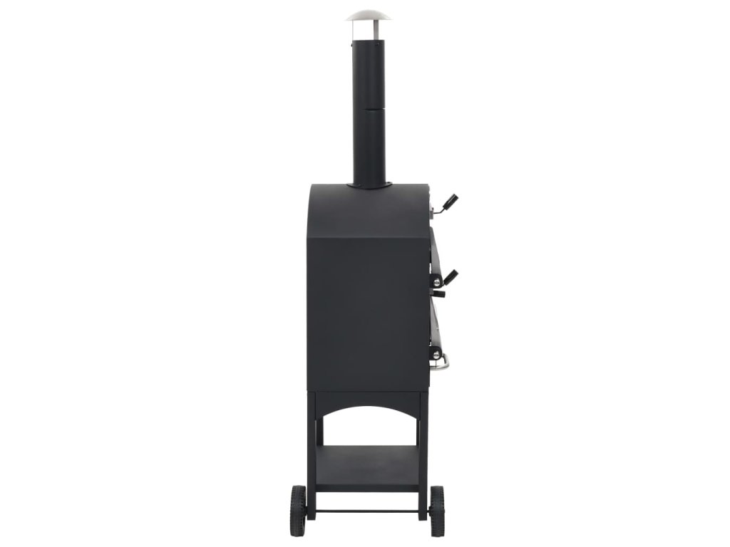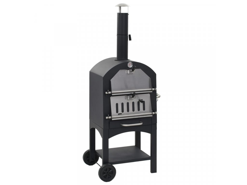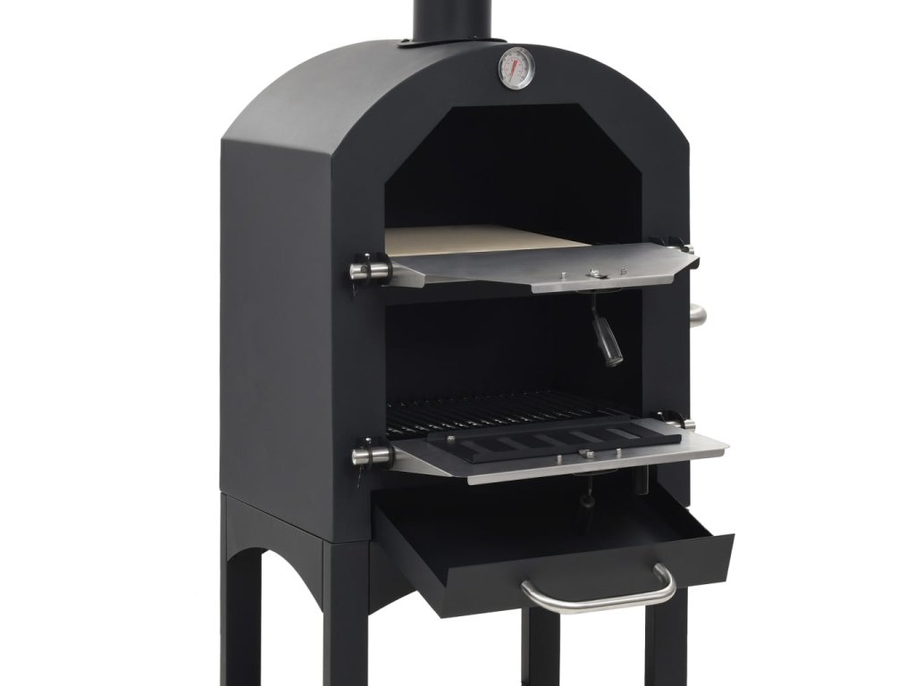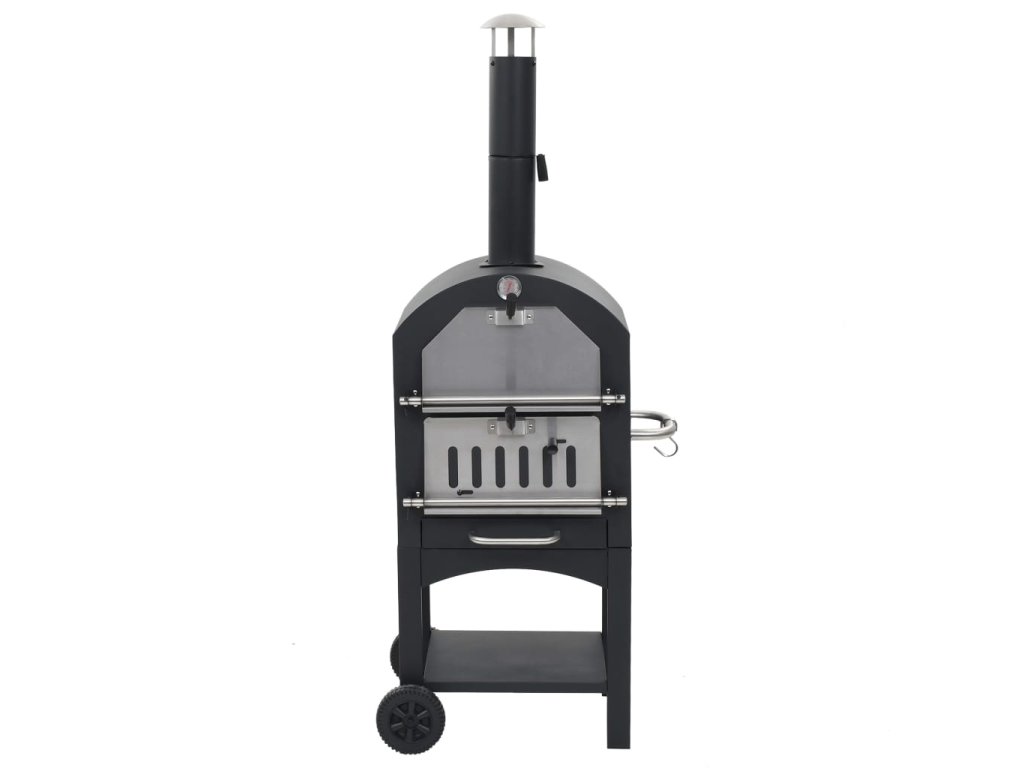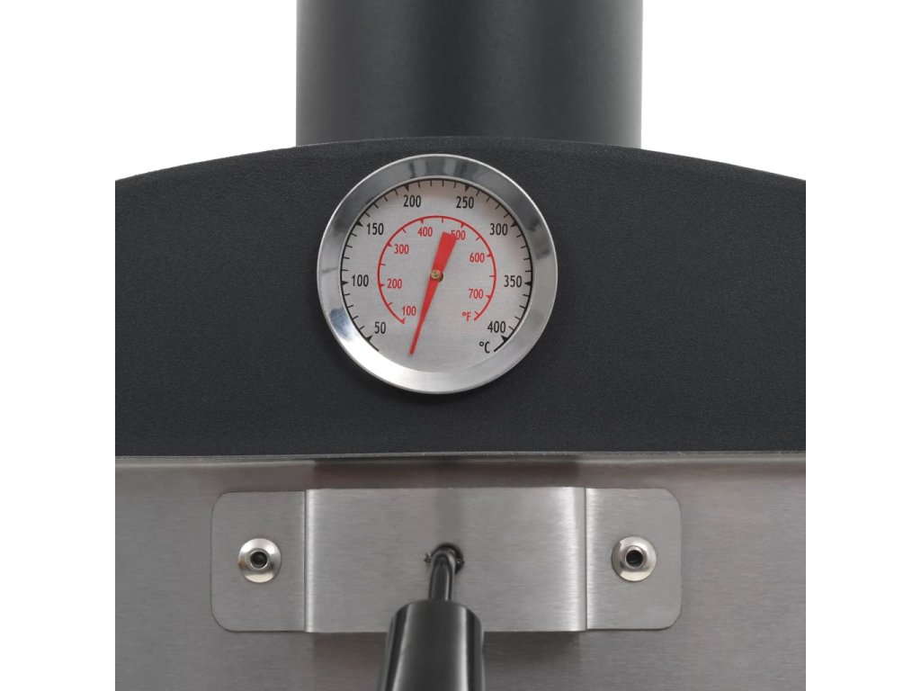 Pec je vyrobena z vysoce kvalitní oceli s práškovým nástřikem a je vysoce odolná a bytelná. Rošt můžete vytáhnout, takže jej lze snadno a rychle vyčistit. Praktická polička pod pecí dobře poslouží jako odkládací prostor na rukavice a další potřeby. Součástí pece je i vestavěný teploměr, který ukazuje teplotu uvnitř pece. Díky dvěma kolečkům můžete pec bez obtíží přesouvat. Součástí balení je i pizza kámen.