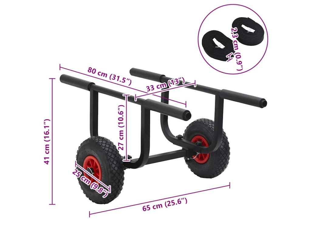 - Efektivní přeprava: Tento kajakový vozík má 2 nafukovací kola, která umožňují efektivnější a snadnější přepravu kajaku.