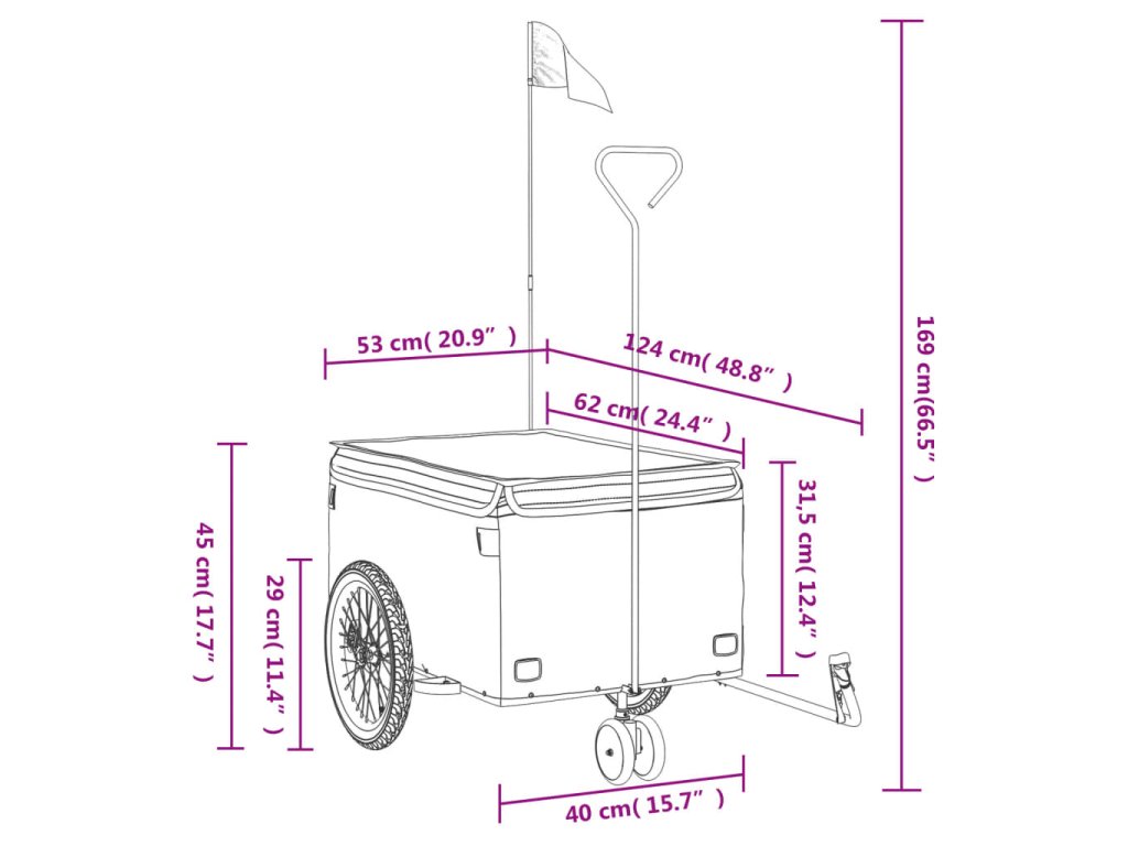 - Robustní materiál: Železo je pevný a tvrdý materiál. Je to oblíbený materiál pro průmyslové a nábytkářské konstrukce. Tento přívěsný vozík za kolo je vyroben ze železa a je velmi robustní a odolný.