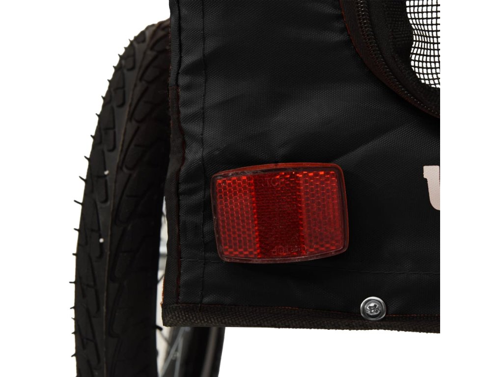 - Bezpečná jízda: Vozík má dvě velká kolečka, která umožňují hladkou a bezpečnou jízdu v různých terénech. Odrazky zajišťují viditelnost ve tmě, navíc vlajka pomůže zvýšit bezpečnost provozu.