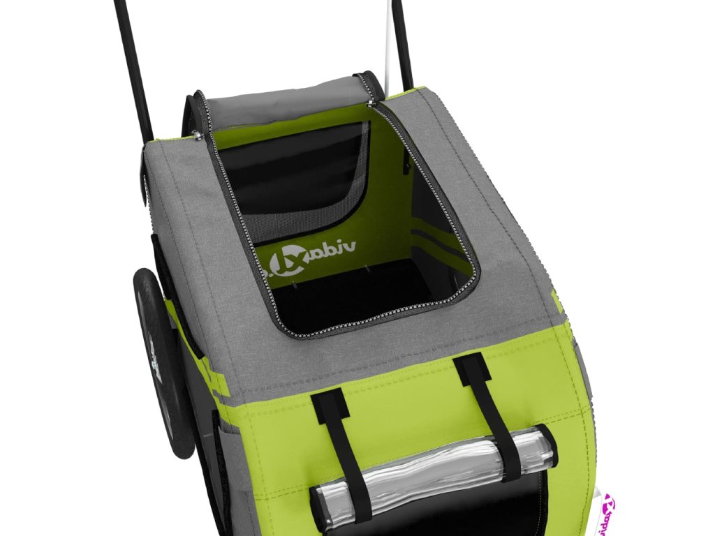 - Bezpečná jízda: Vozík má dvě velká kolečka, která umožňují hladkou a bezpečnou jízdu v různých terénech. Odrazky zajišťují viditelnost ve tmě, navíc vlajka pomůže zvýšit bezpečnost provozu.