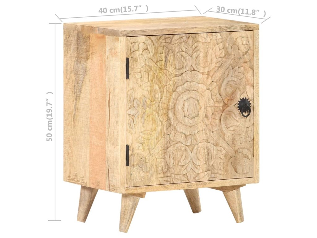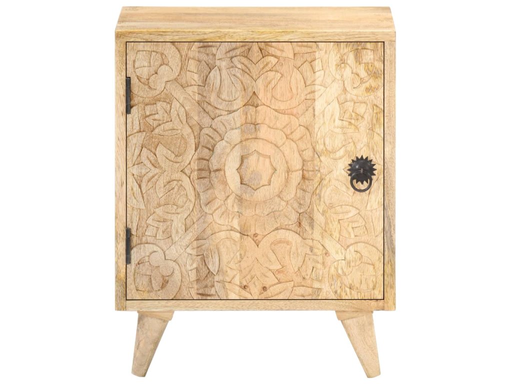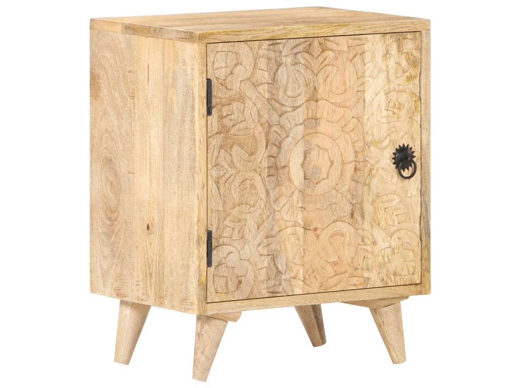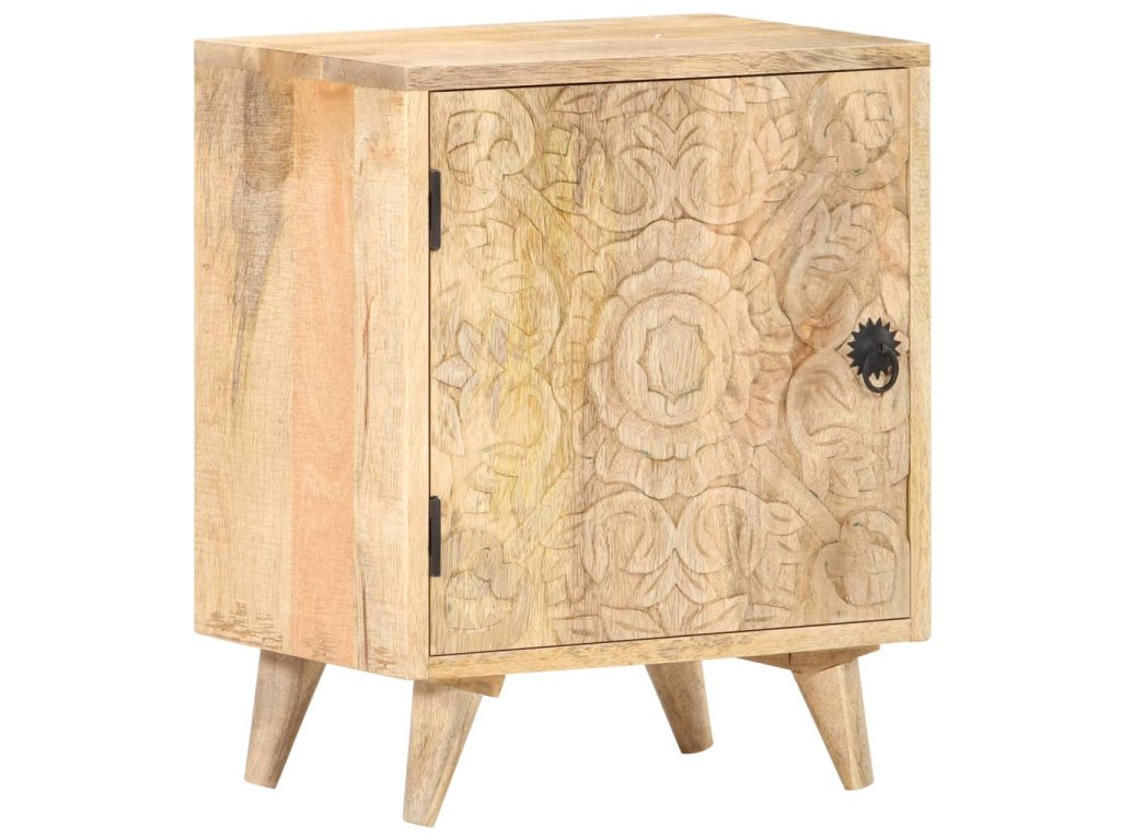 Noční stolek je vyrobený z masivního mangovníkového dřeva s přírodním povrchem. Mangovník je tvrdé dřevo s hustou kresbou. Hrubé mangovníkové dřevo je schopné nést těžkou váhu a také odolává opotřebení při každodenním používání. Tato krásně navržená skříňka do ložnice je stabilní, má dlouhou životnost a je atraktivní na pohled. Její nohy zvyšují robustnost nábytku. Odolná horní část skříňky je ideální místo pro vaše dekorativní předměty, jako jsou vázy nebo květináče. Ve skříňce je přihrádka s vyřezávanými dvířky, která poskytuje dostatek úložného prostoru pro uspořádání vašich poznámkových bloků, knih a různých dalších věcí.