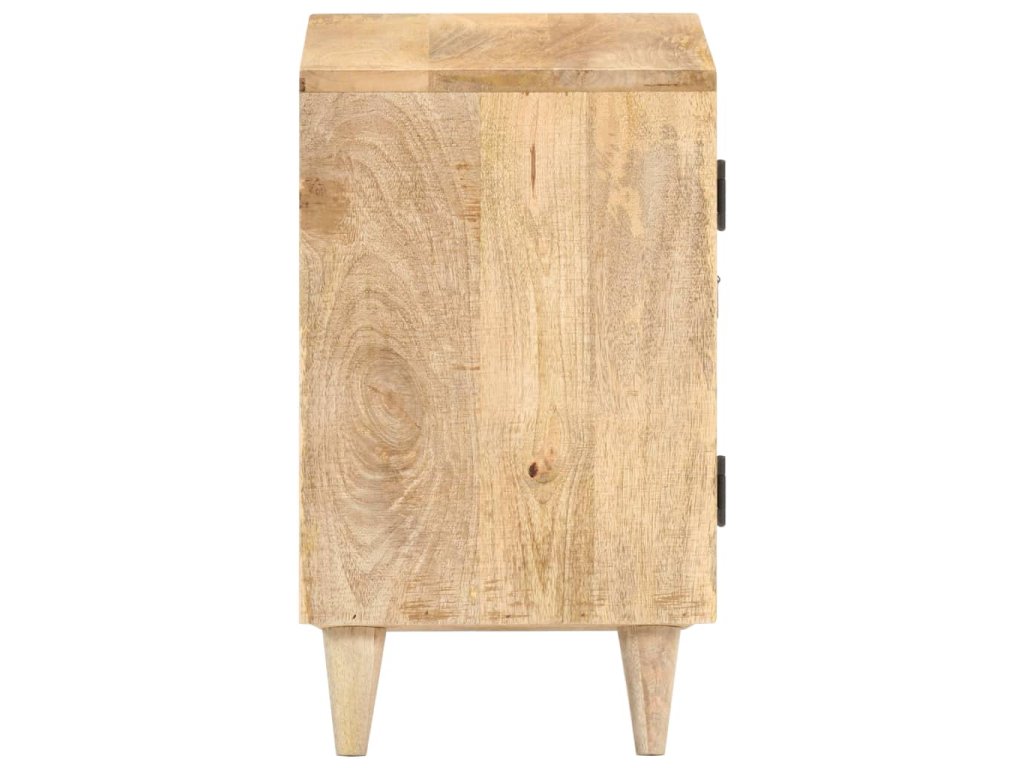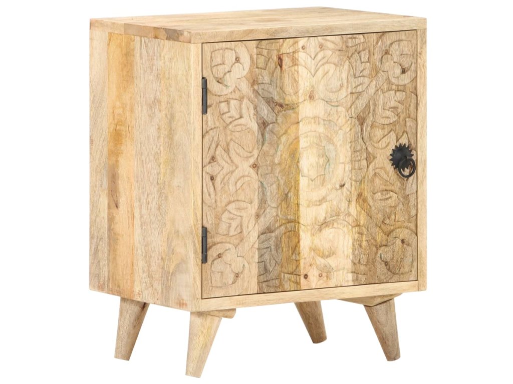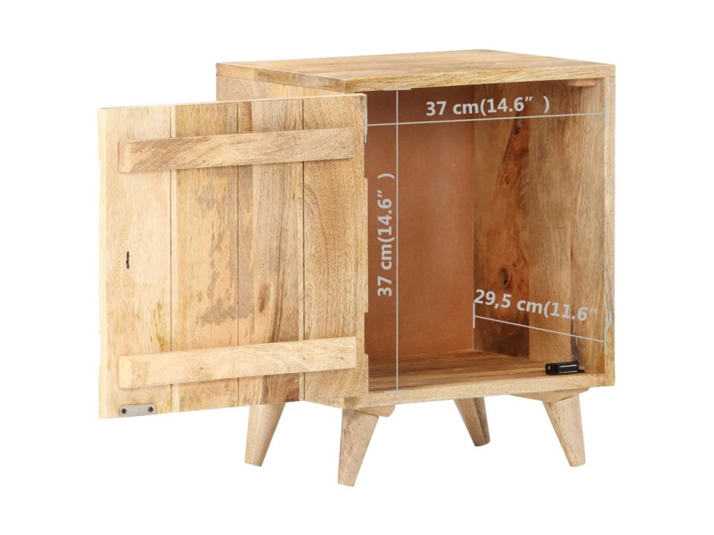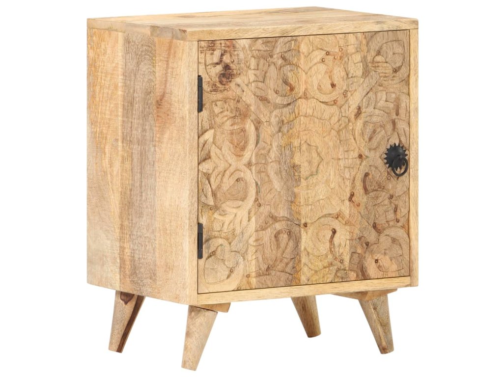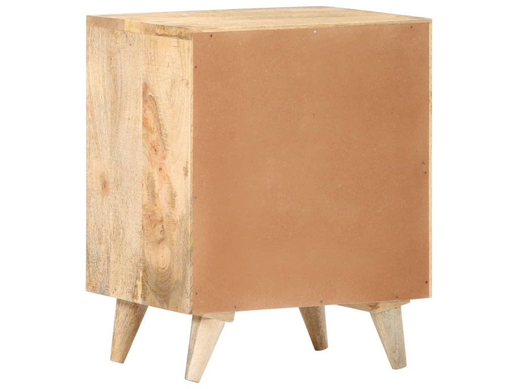 Noční stolek je vyrobený z masivního mangovníkového dřeva s přírodním povrchem. Mangovník je tvrdé dřevo s hustou kresbou. Hrubé mangovníkové dřevo je schopné nést těžkou váhu a také odolává opotřebení při každodenním používání. Tato krásně navržená skříňka do ložnice je stabilní, má dlouhou životnost a je atraktivní na pohled. Její nohy zvyšují robustnost nábytku. Odolná horní část skříňky je ideální místo pro vaše dekorativní předměty, jako jsou vázy nebo květináče. Ve skříňce je přihrádka s vyřezávanými dvířky, která poskytuje dostatek úložného prostoru pro uspořádání vašich poznámkových bloků, knih a různých dalších věcí.