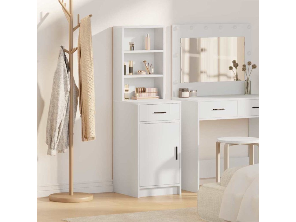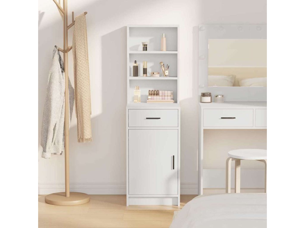 - Konstrukce z kompozitního dřeva Tenhle moderní vysoký kabinet je převážně z kompozitního dřeva, takže má pevnou strukturu, co unese kdeco v uložených prostorách. Matný povrch na rámu a úchytkách nejenže vypadá moderně, ale také pomáhá, aby povrch nebyl otravně lesklý.
