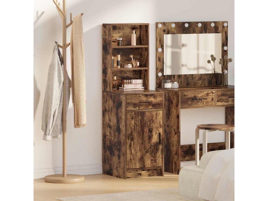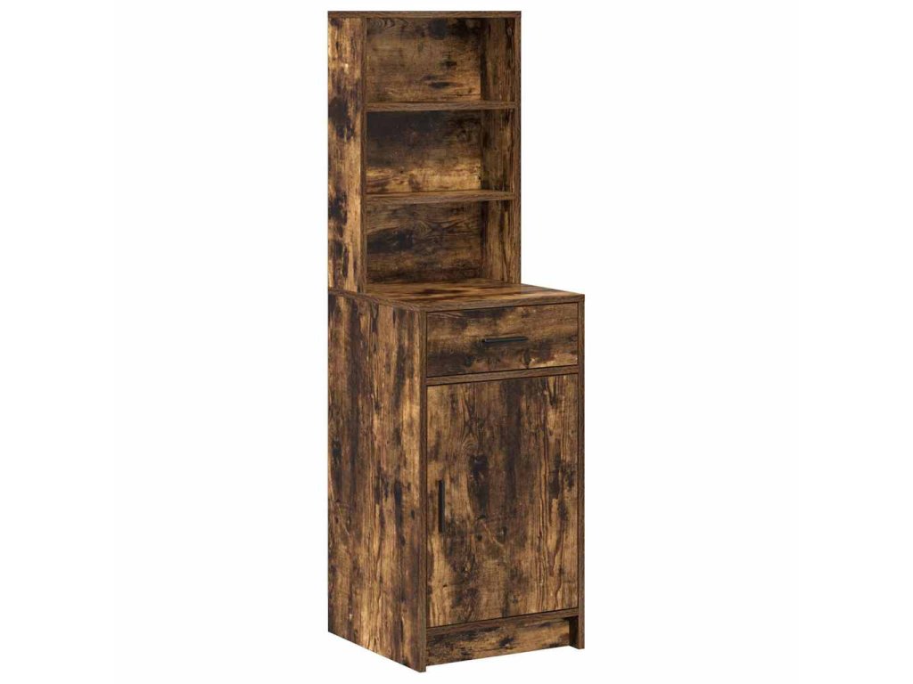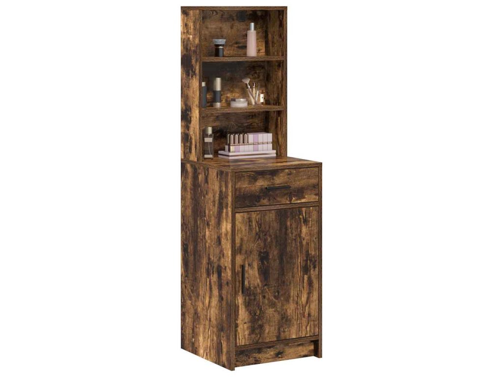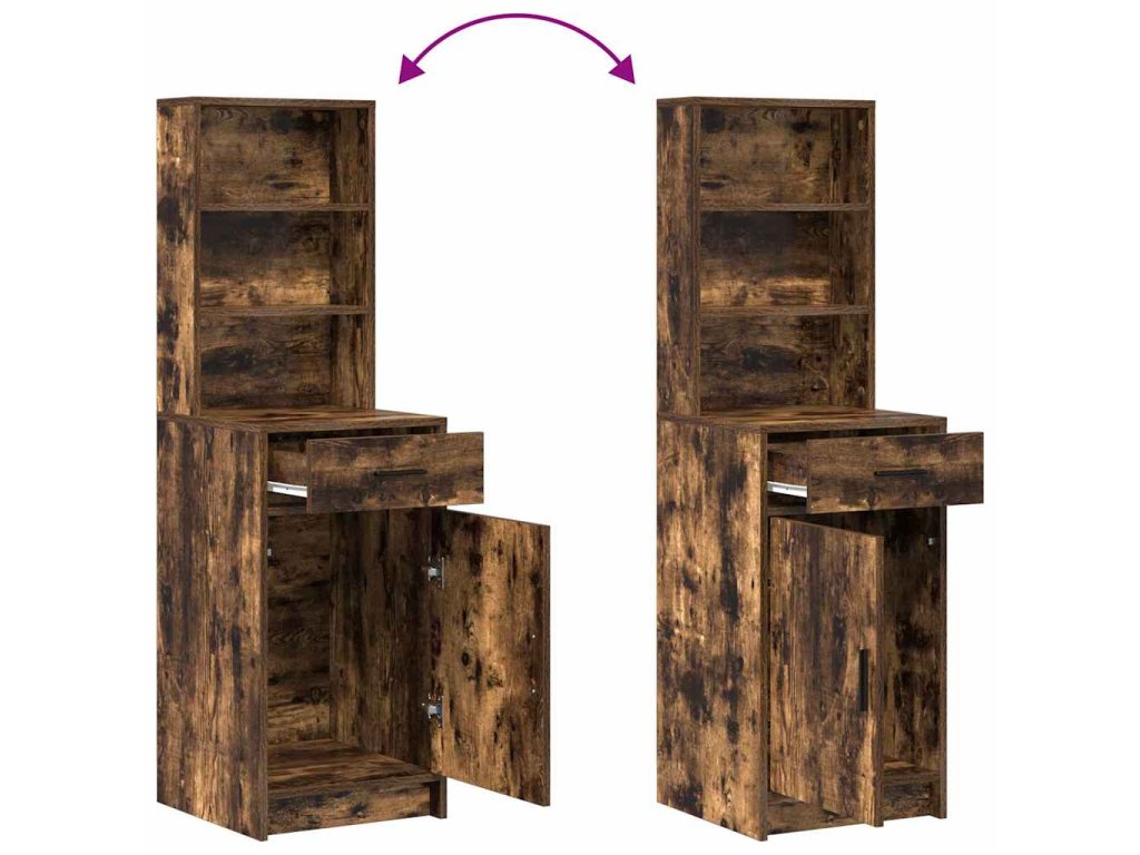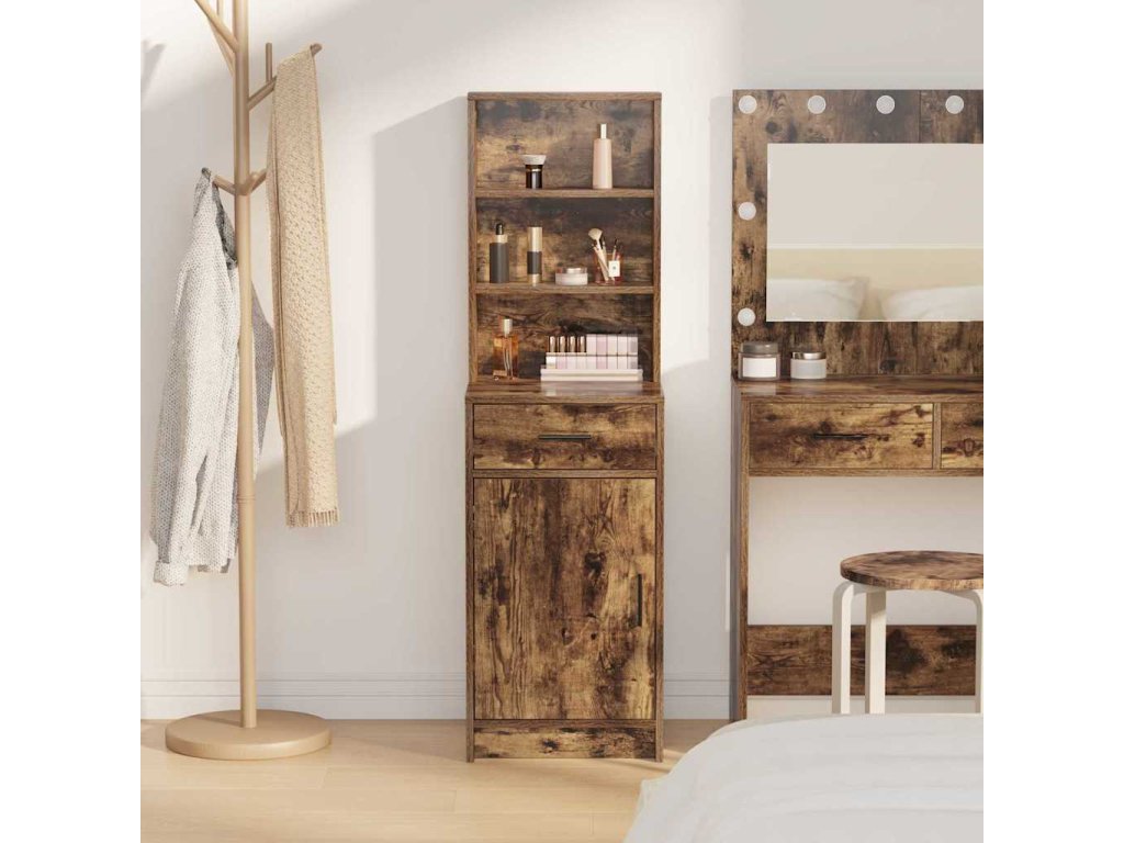 - Konstrukce z kompozitního dřeva Tenhle moderní vysoký kabinet je převážně z kompozitního dřeva, takže má pevnou strukturu, co unese kdeco v uložených prostorách. Matný povrch na rámu a úchytkách nejenže vypadá moderně, ale také pomáhá, aby povrch nebyl otravně lesklý.