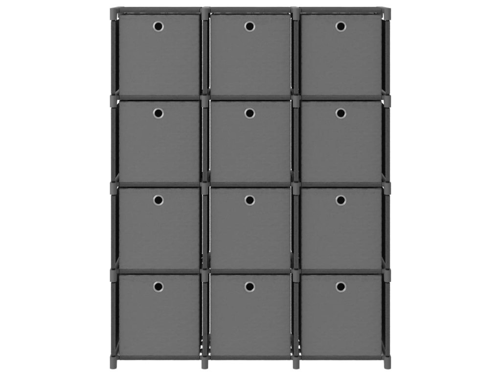 Úložný regál je vyrobený z tkaniny a ocelového rámu, takže je pevný a stabilní. Tento volně stojící regál má 12 otevřených přihrádek a každá z nich obsahuje látkový box, který poskytuje dostatek úložného prostoru pro vaše věci a pomáhá vám udržovat váš pokoj uklizený. Pokud vyjmete boxy, domácí úložný regál vám navíc poslouží jako ideální místo k vystavení knih, sběratelských předmětů, fotografií, ocenění a menších pokojových rostlin.