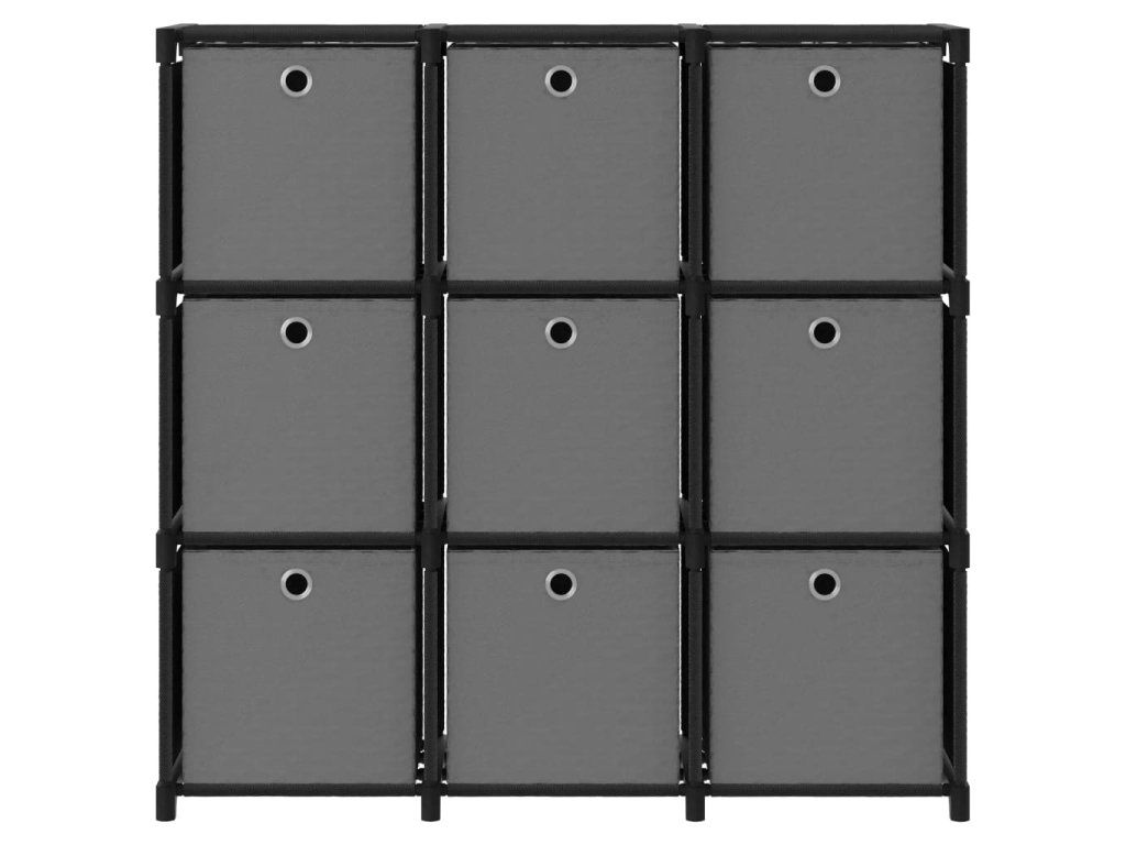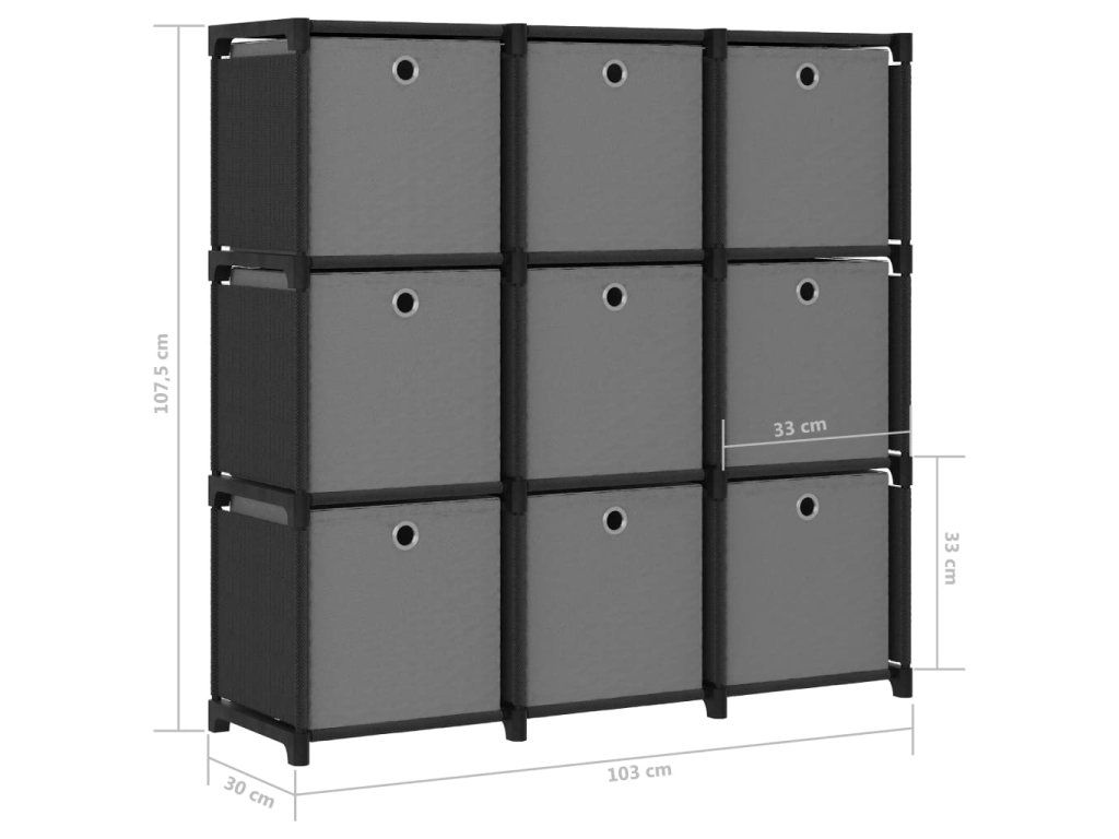 Úložný regál je vyrobený z tkaniny a ocelového rámu, takže je pevný a stabilní. Tento volně stojící regál má 9 otevřených přihrádek a každá z nich obsahuje látkový box, který poskytuje dostatek úložného prostoru pro vaše věci a pomáhá vám udržovat váš pokoj uklizený. Pokud vyjmete boxy, domácí úložný regál vám navíc poslouží jako ideální místo k vystavení knih, sběratelských předmětů, fotografií, ocenění a menších pokojových rostlin.