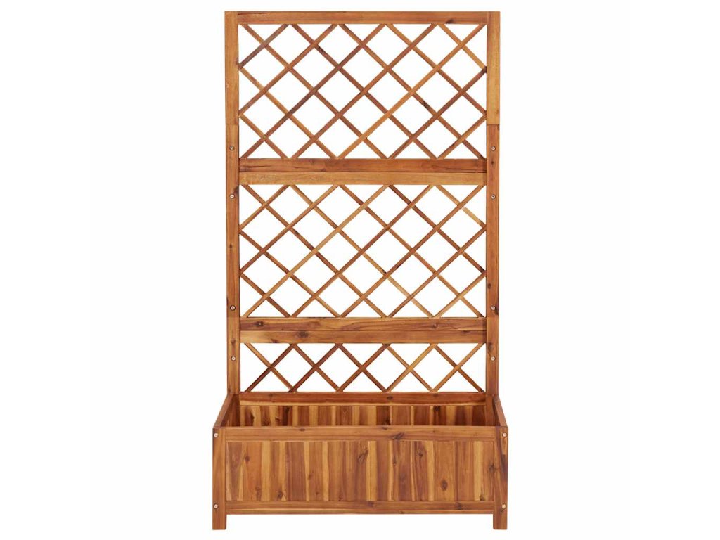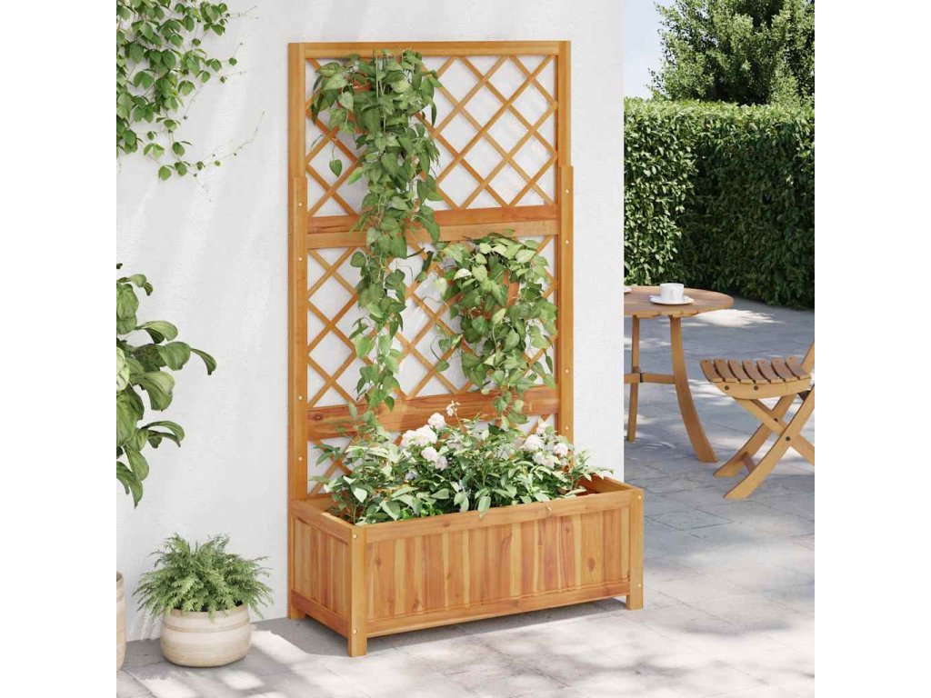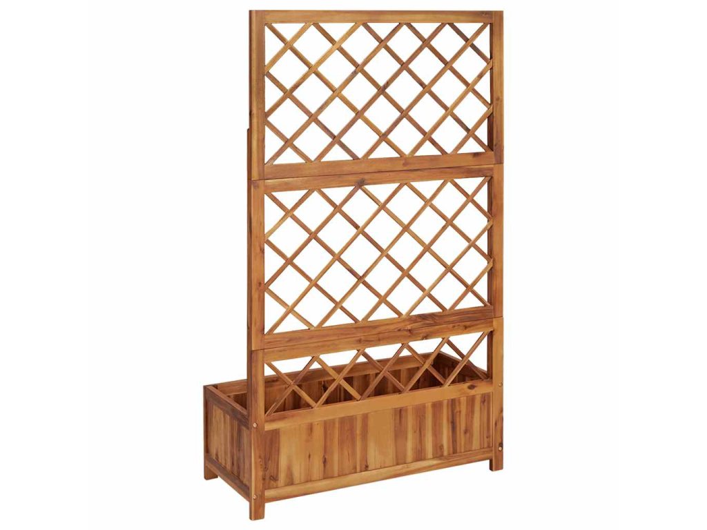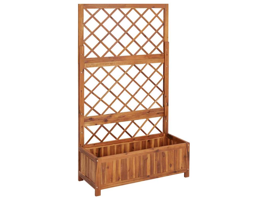 Truhlík s treláží má velký box na květiny, kam si můžete zasadit celou řadu zelených rostlinek i květin. Vestavěná treláž nabízí skvělou oporu pro popínavé rostliny, jako jsou bylinky, rajčata, fazole apod. Produkt je navíc vyrobený z masivního akáciového dřeva s olejovaným povrchem, výborně tedy vzdoruje povětrnostním vlivům a je dostatečně odolný, abyste ho mohli venku používat po celý rok.