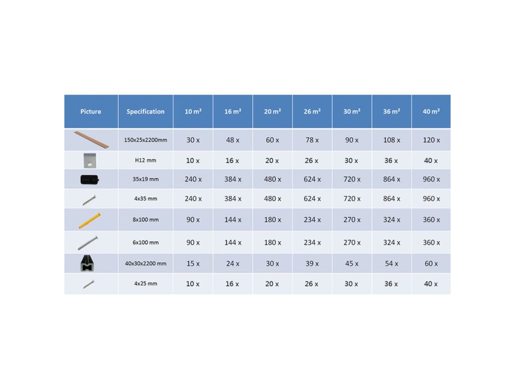 Balení obsahuje 30 podlahových prken na terasu, 10 svorek na první a poslední prkno, 240 plastových oddělovačů, 240 šroubů z nerezové oceli, 90 plastových hmoždinek pro rozpínací šrouby, 90 rozpínacích šroubů z nerezové oceli, 10 šroubů (4 x 25 mm) a 15 nosníků.