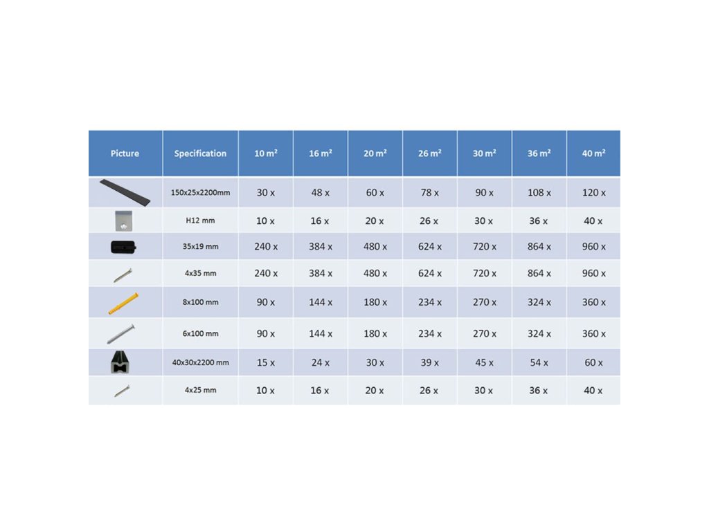 - 10 x svorka na první a poslední prkno (nerezová ocel)