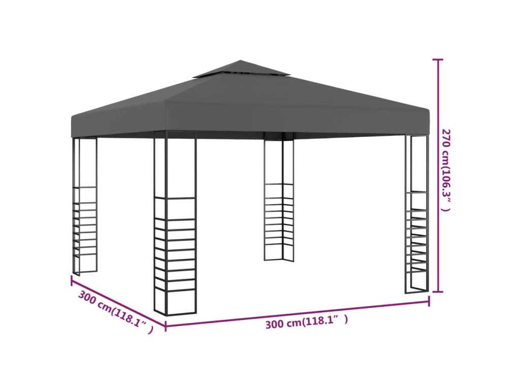 Rám je celý vyrobený ze železa, což mu dodává na pevnosti a stabilitě. Co se týče střechy altánu, je ze 100% polyesteru s polyamidovou vrstvou. Uchrání vás tedy nejen před škodlivými UV paprsky, ale také před deštěm. Design altánu je velmi stylový. Dvojitá střecha je zhotovená s průduchy, které zlepšují cirkulaci vzduchu pro větší pohodlí. Montáž je velmi snadná.