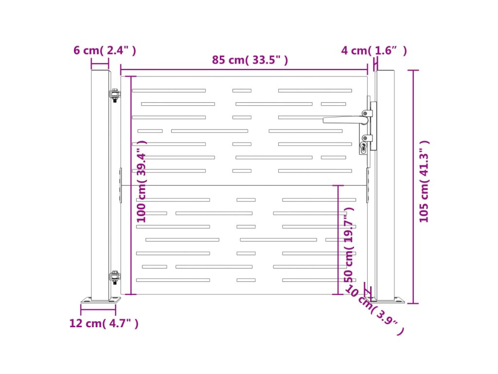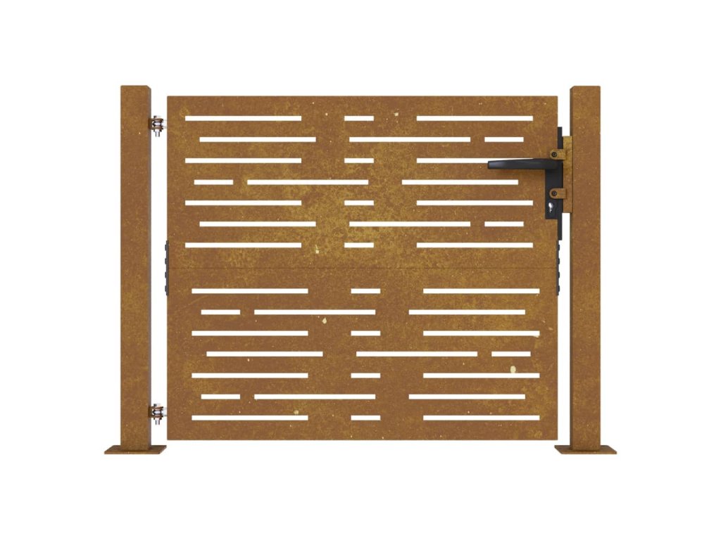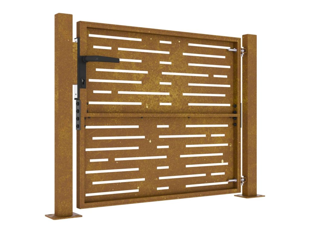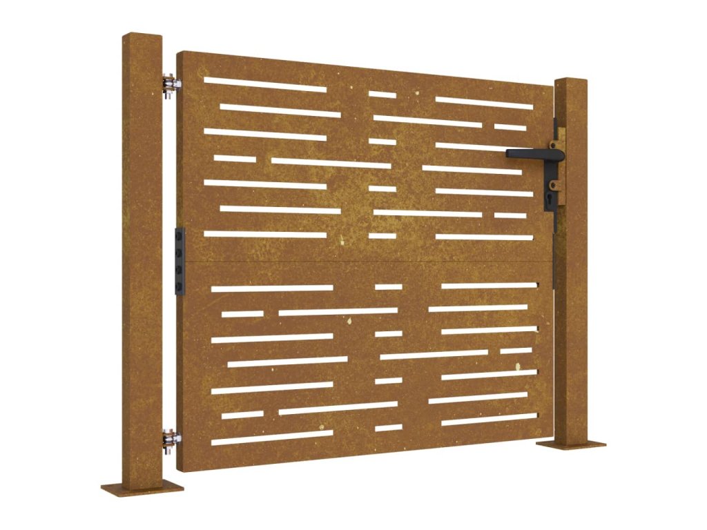- Materiál s dlouhou životností: Kovová branka je vyrobená z cortenové oceli. Cortenová ocel, také známá jako povětrnostně odolná ocel. Je ze své podstaty antikorozní. Při prvním vystavení atmosférickým podmínkám se na ní vytvoří rezavá ochranná vrstva proti korozi. Nemusíte ji tedy natírat. Tím ušetříte náklady na údržbu a opravy. Výrazný hnědý odstín cortenové oceli jistě upoutá pozornost. Povětrnostně odolná ocel je výjimečně odolná a obstojí ve zkoušce času.