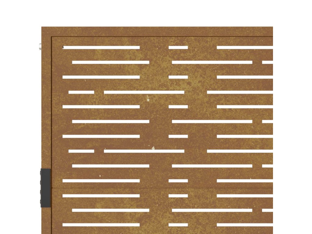 - Odolná konstrukce: Tato zahradní branka je vyrobená z cortenové oceli. Cortenová ocel, také známá jako povětrnostně odolná ocel. Je ze své podstaty antikorozní. Při prvním vystavení atmosférickým podmínkám se na ní vytvoří rezavá ochranná vrstva proti korozi. Nemusíte ji tedy natírat. Tím ušetříte náklady na údržbu a opravy. Výrazný hnědý odstín cortenové oceli jistě upoutá pozornost. Povětrnostně odolná ocel je výjimečně odolná a obstojí ve zkoušce času.